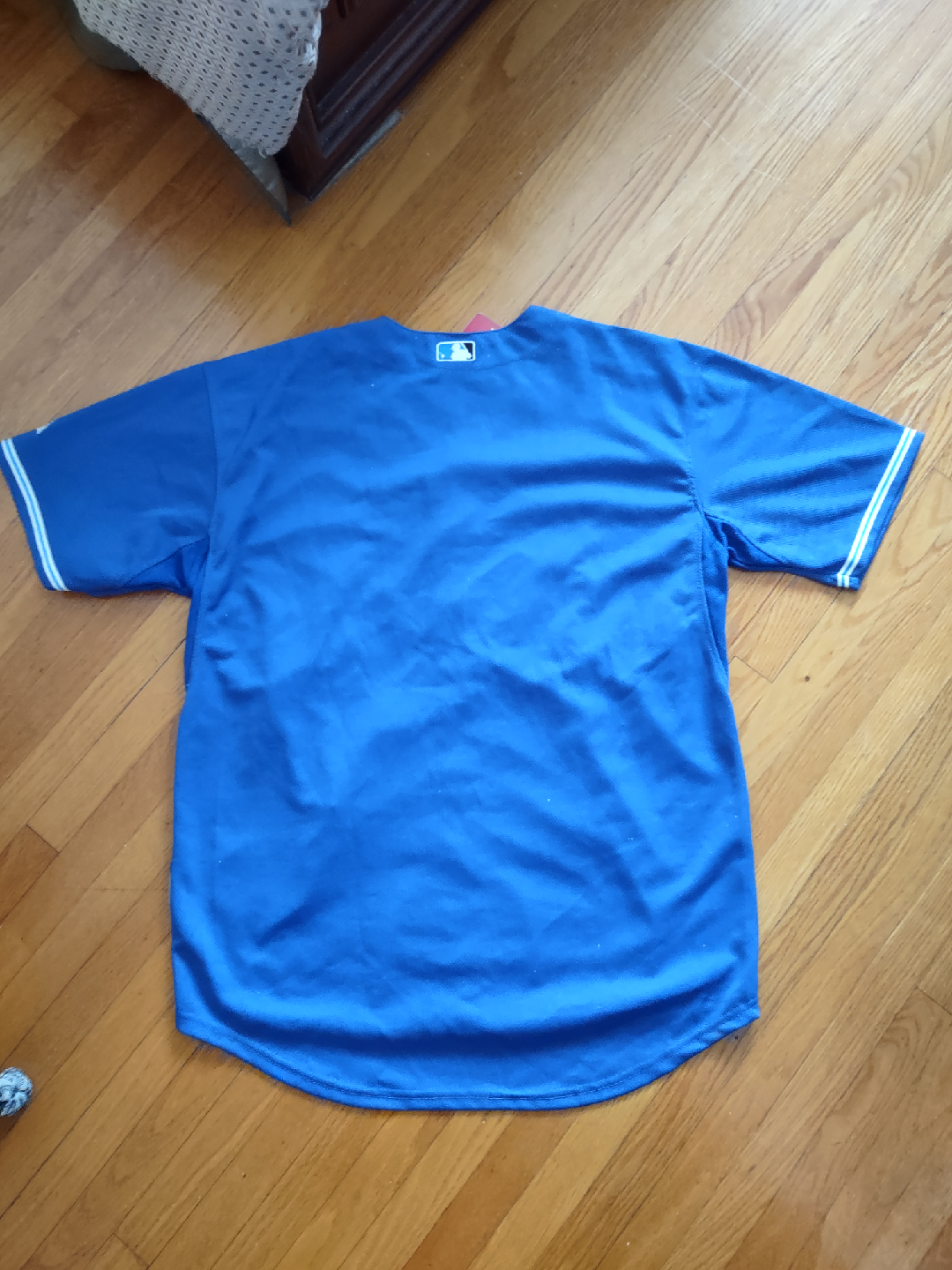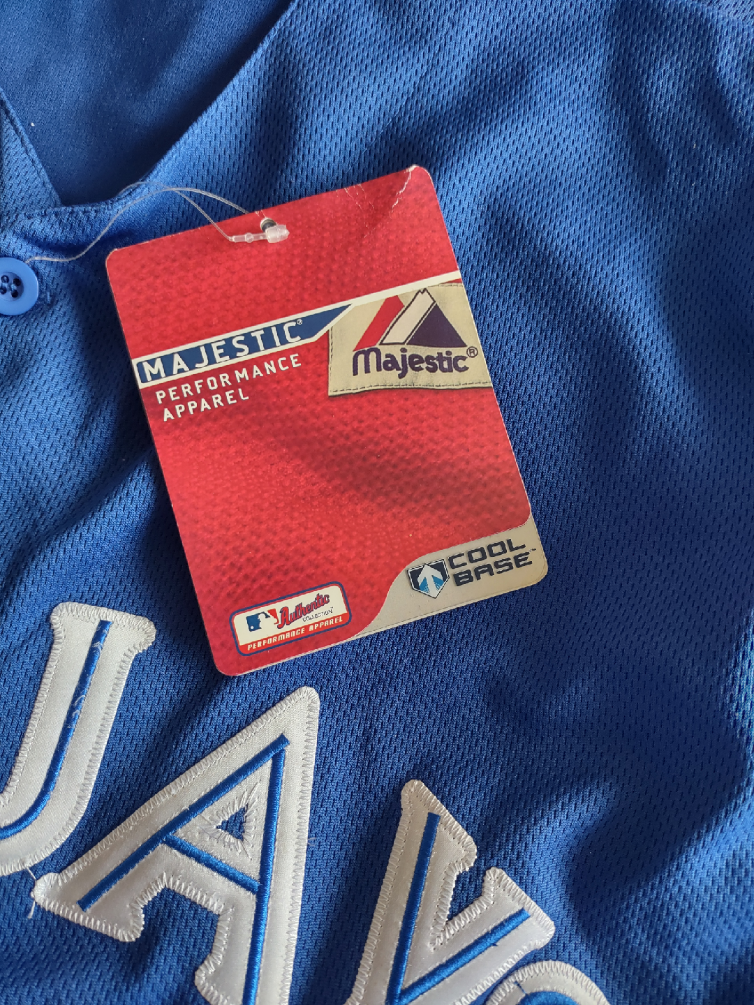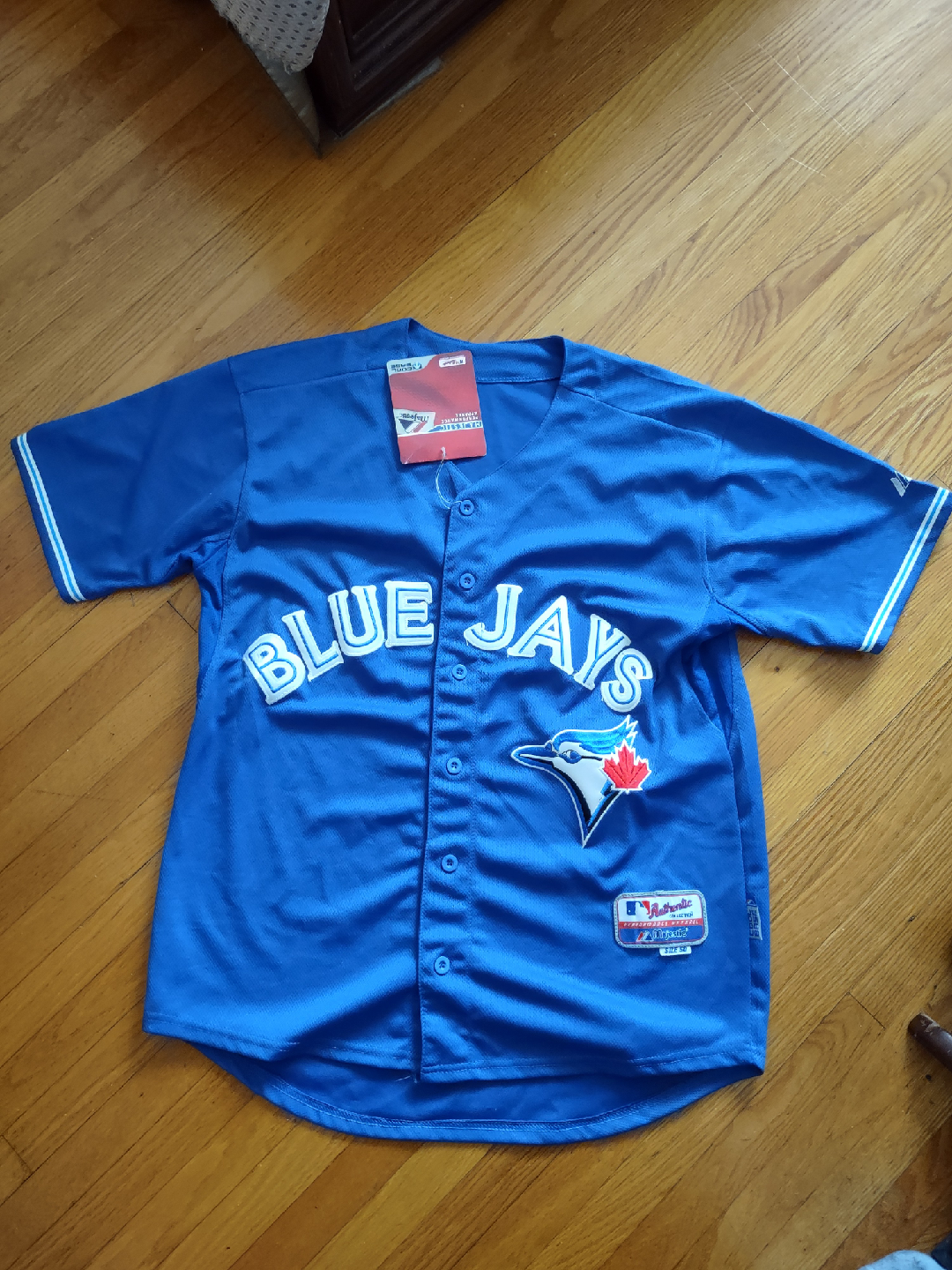 Selling a Toronto Blue Jays baseball jersey by Majestic! It's a vibrant blue and features the classic Blue Jays logo. The size is 50. Perfect for any Jays fan!