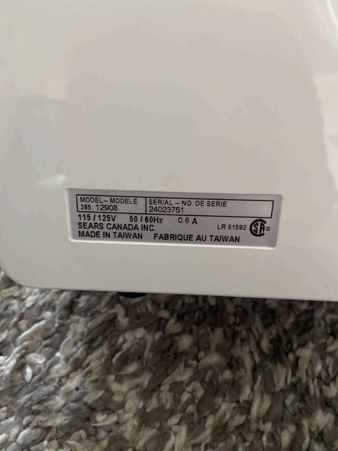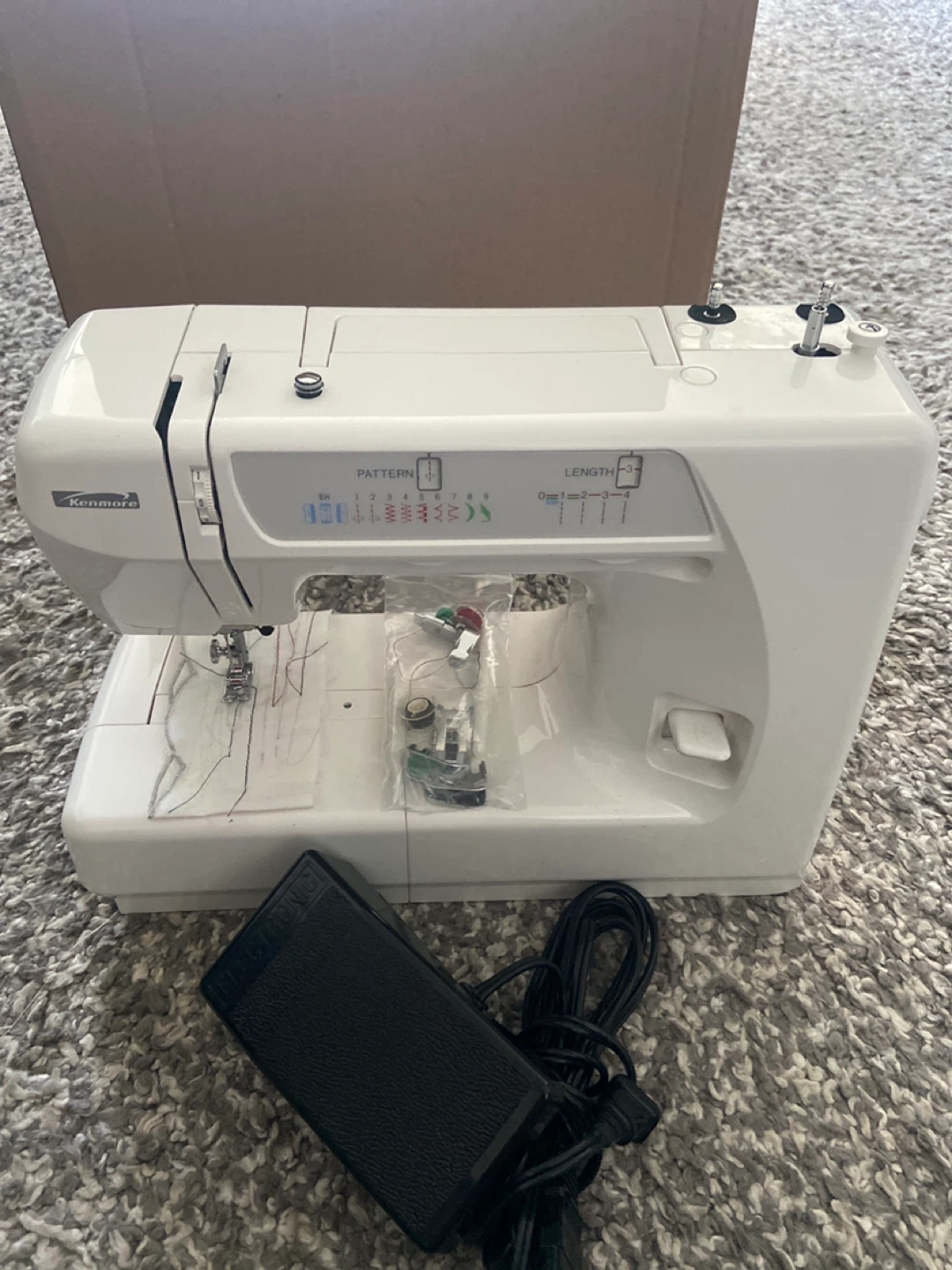 Selling a Kenmore sewing machine in good condition. It's a model 385.12908. Includes the foot pedal and some accessories. Ready for a new home!