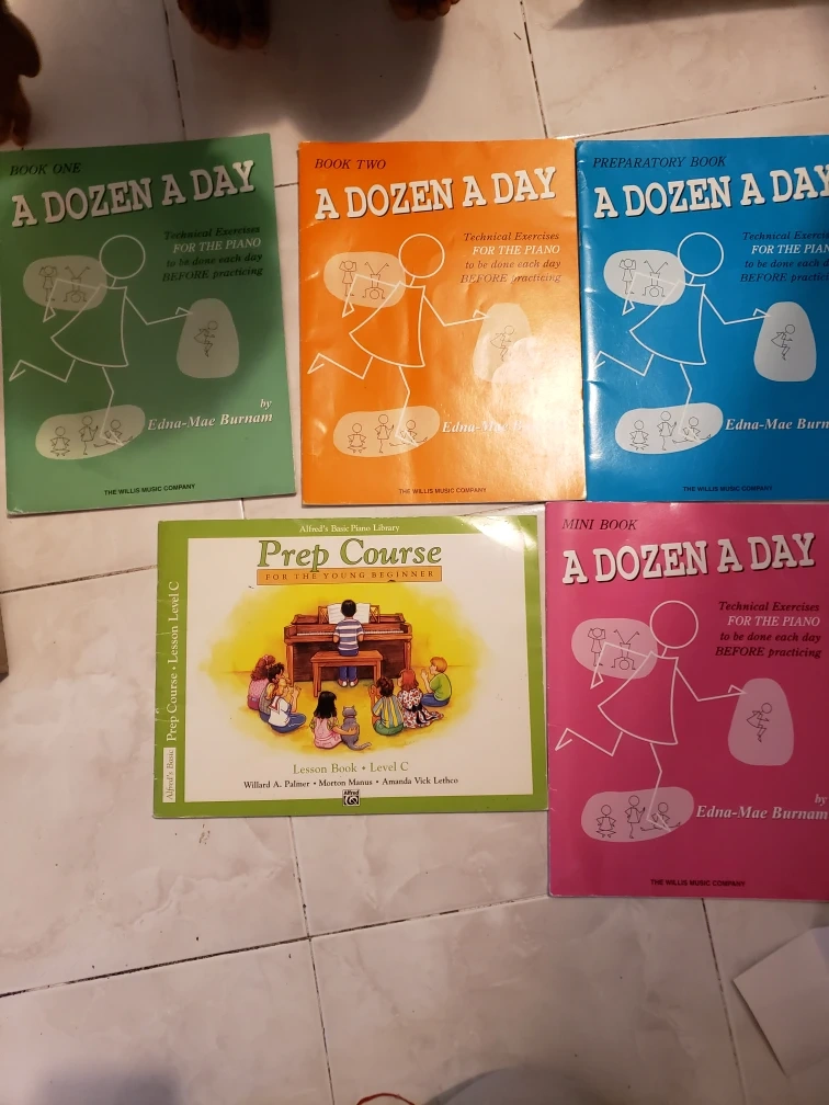 189UNMARKED 2/EACH OR ALL FOR 8 Selling a set of piano books called "A Dozen A Day" by Edna-Mae Burnham. Includes Book One, Book Two, Preparatory Book, Mini Book, and Alfred's Basic Prep Course. Great for young beginners!