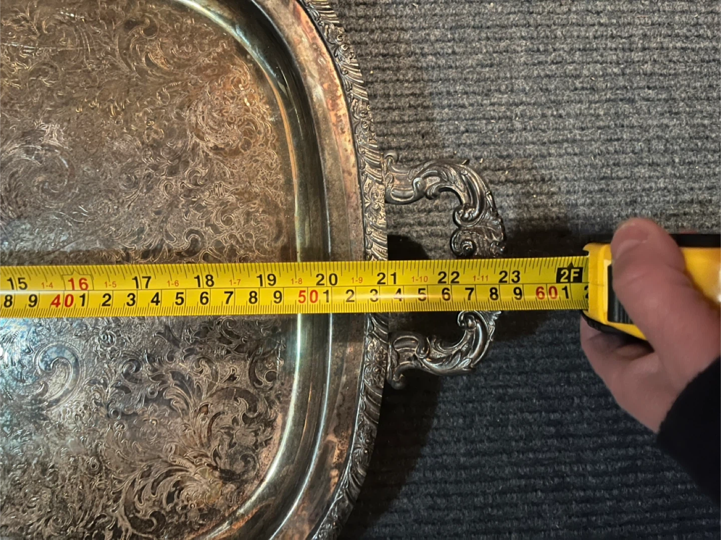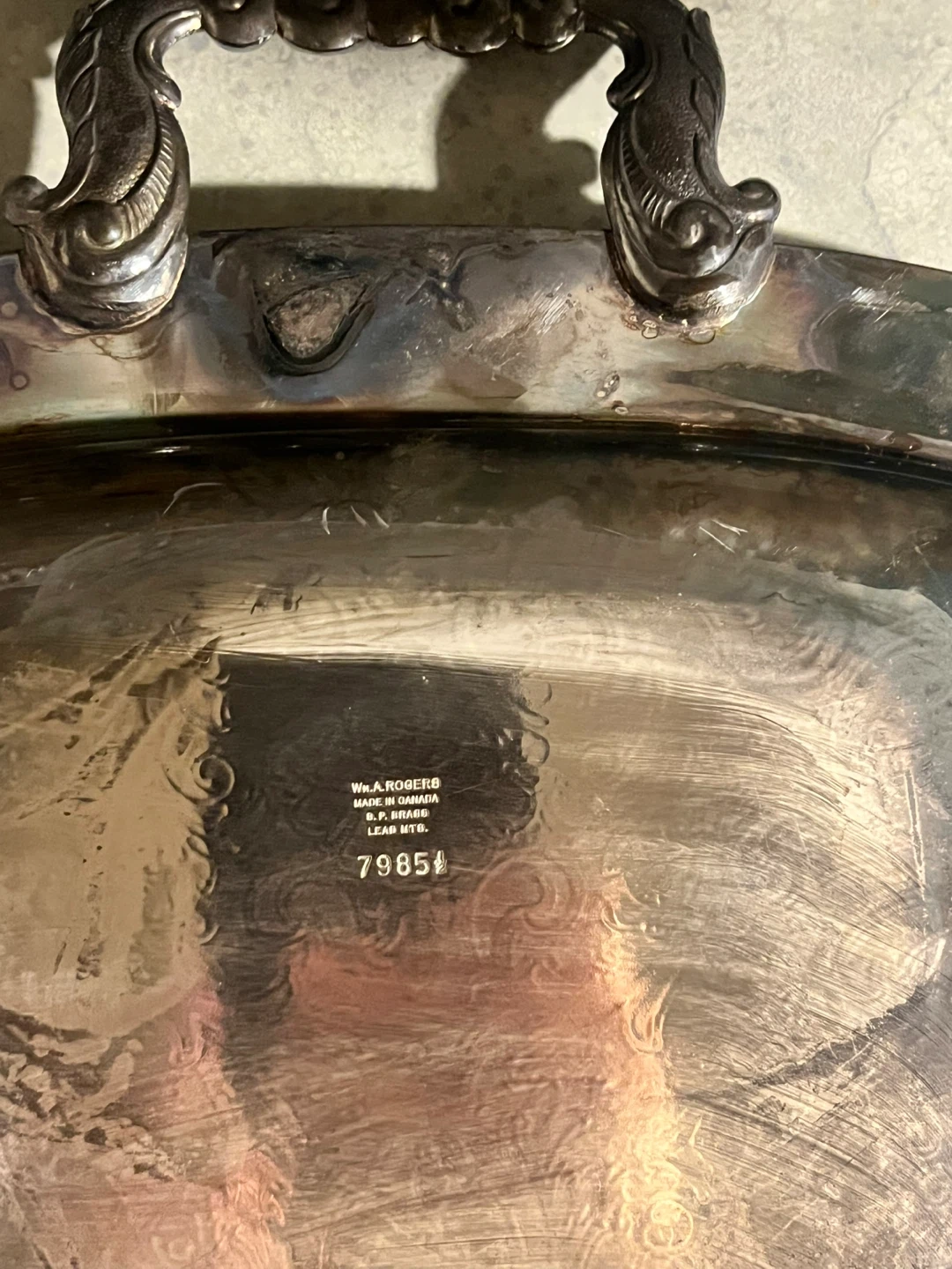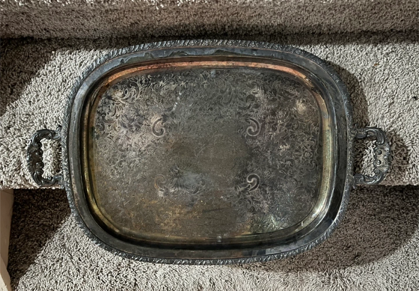 Selling a vintage silver plated serving tray! It has ornate handles and a decorative floral pattern on the surface. It shows some signs of wear and tarnish, which adds to its vintage charm