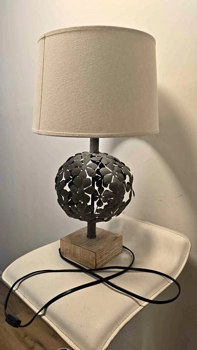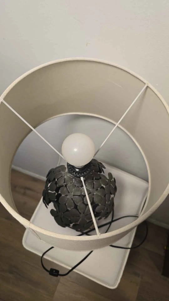 Beautiful decorative table lamp featuring a floral-patterned metal base and a neutral linen shade. Adds a warm, cozy glow to any room — perfect for bedside tables, living rooms, or offices.