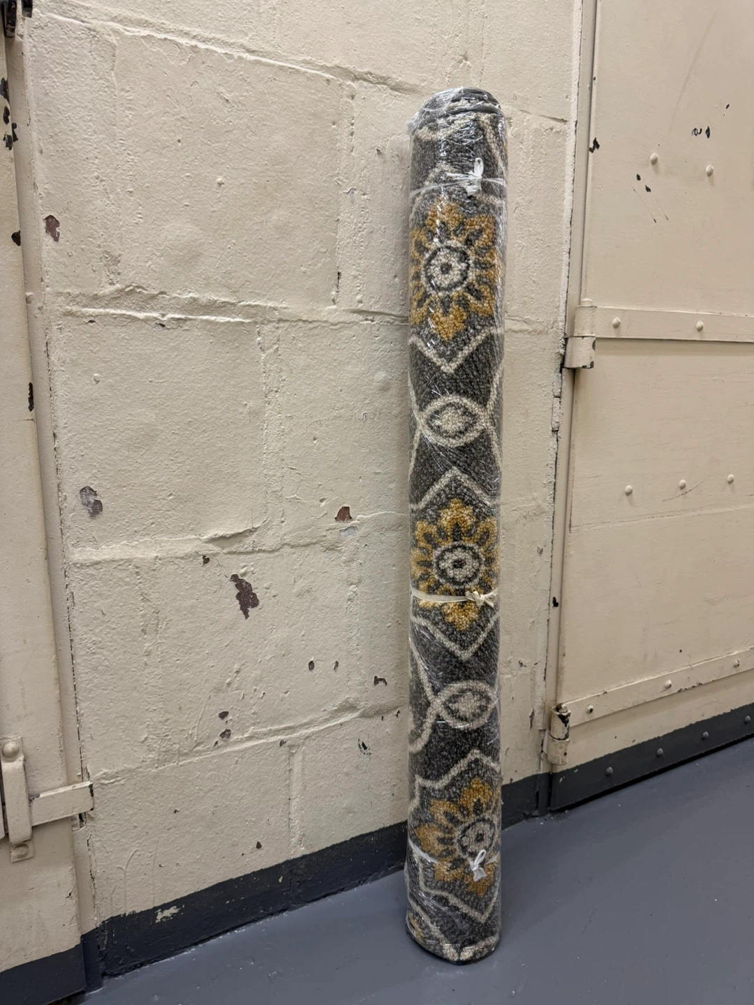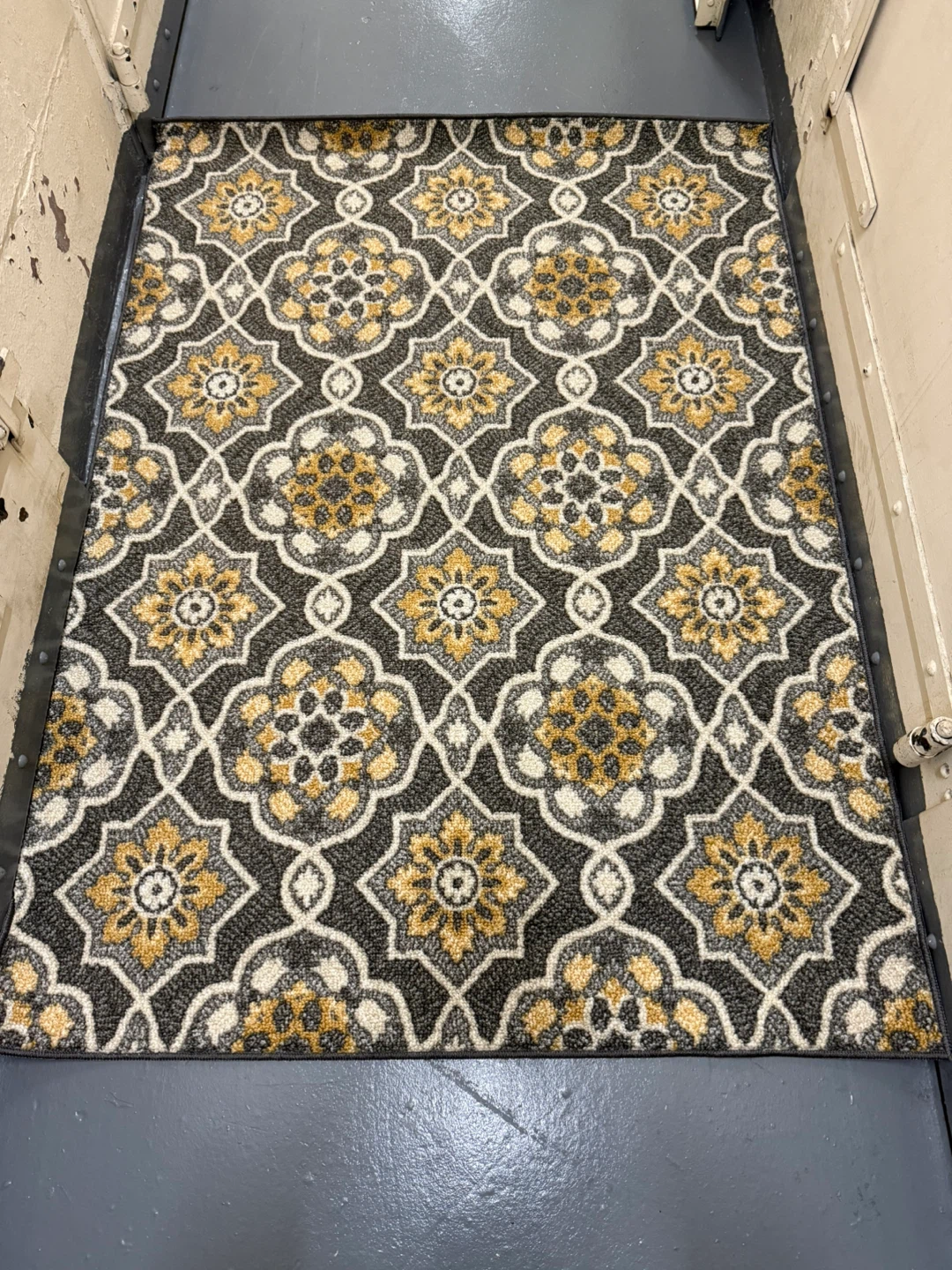I'm selling a rug with a beautiful floral pattern. It features a mix of gray, white, and yellow colors that would complement any room. This rug is in good condition and ready to add a touch of elegance to your home
