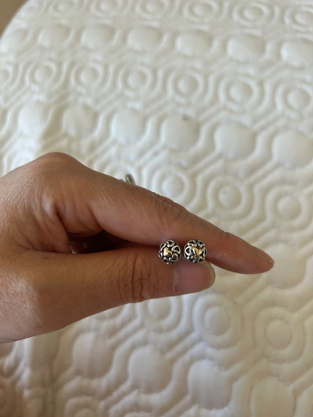 Here are some cute Pandora stud earrings! They are silver with a gold accent in the middle. They have a heart design on them. Perfect for everyday wear!