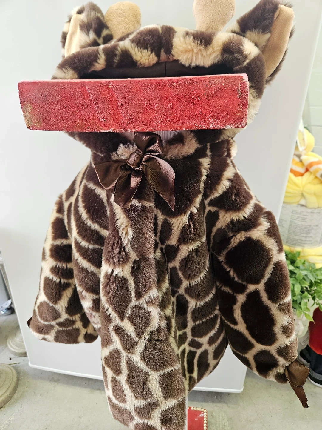Check out this super cute giraffe print hooded jacket! It's made of a soft faux fur material and features a sweet brown bow detail. Perfect for keeping cozy and stylish!