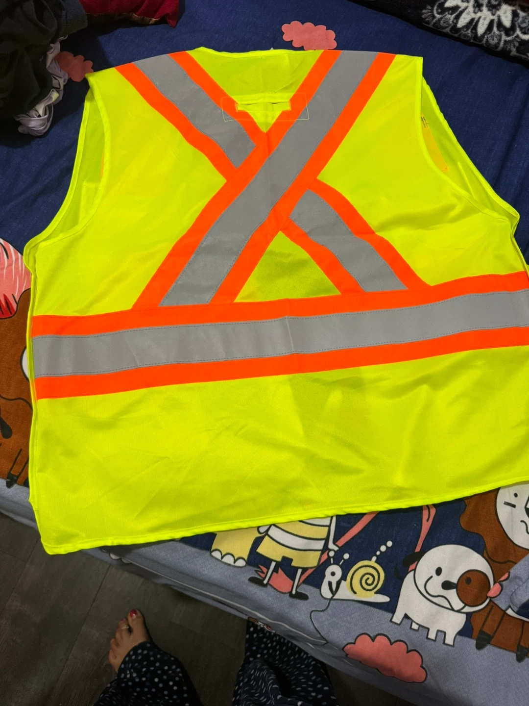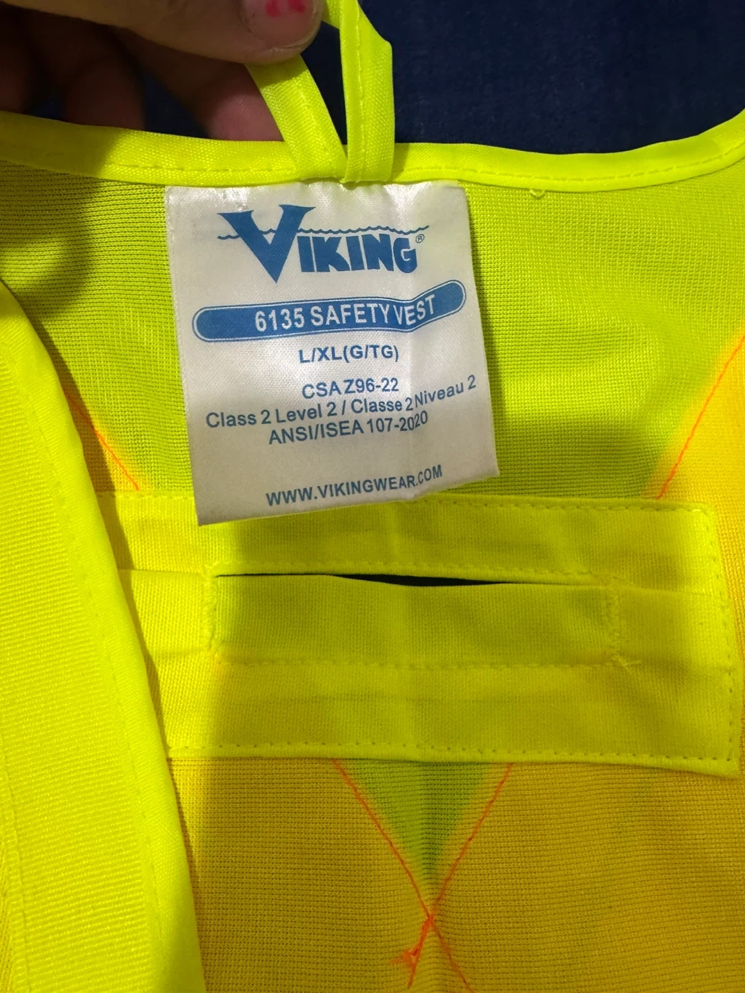 Selling a Viking 6135 safety vest in size L/XL. It's a high-visibility vest perfect for work or any activity where you need to be seen. The vest meets CSA Z96-22 Class 2 Level 2 standards and ANSI/ISEA 107-2020 requirements.