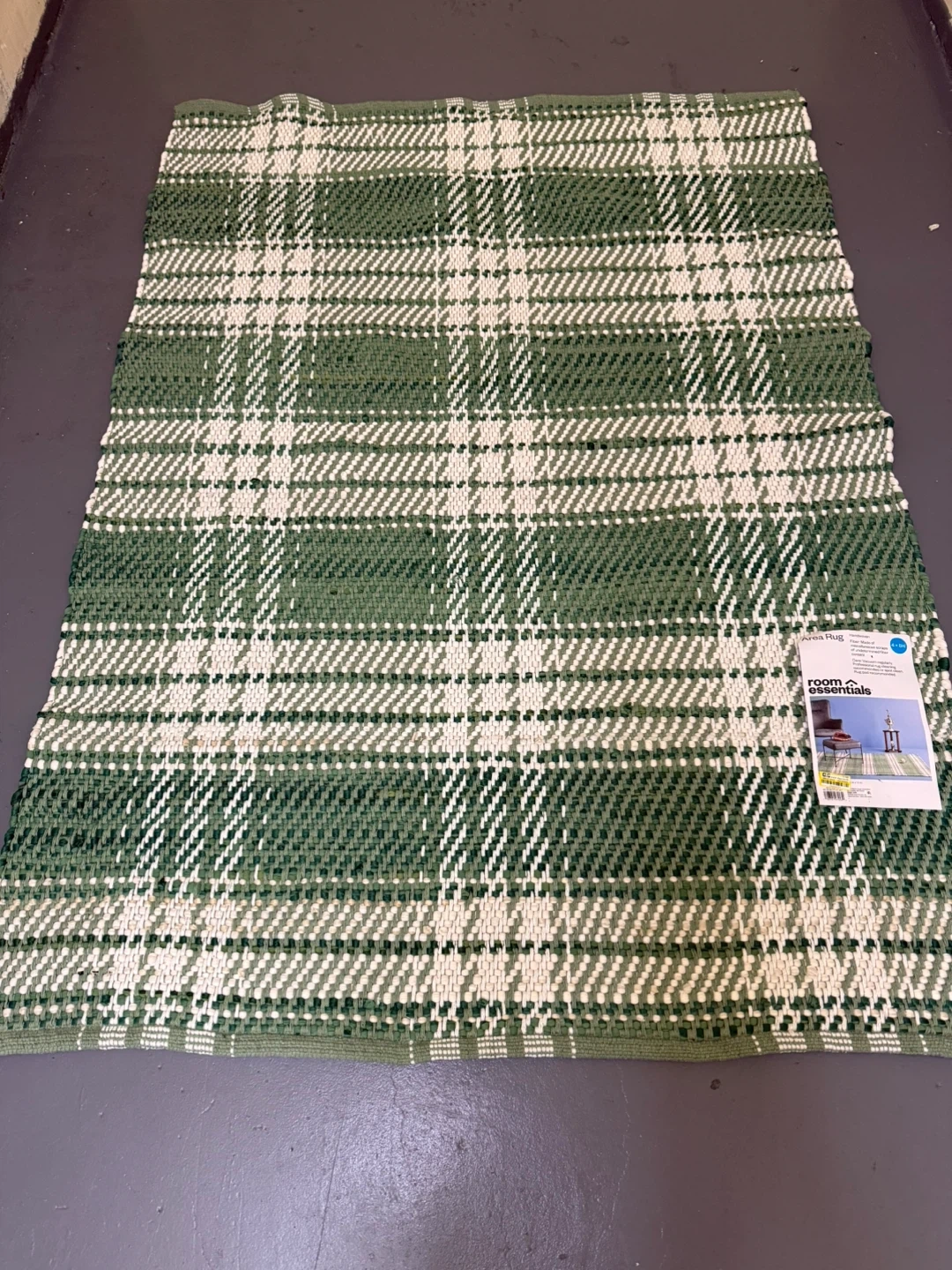 Selling a Room Essentials Chindi area rug in a green plaid pattern! It's in great condition and ready to add some style to your space. Perfect for any room in your home!