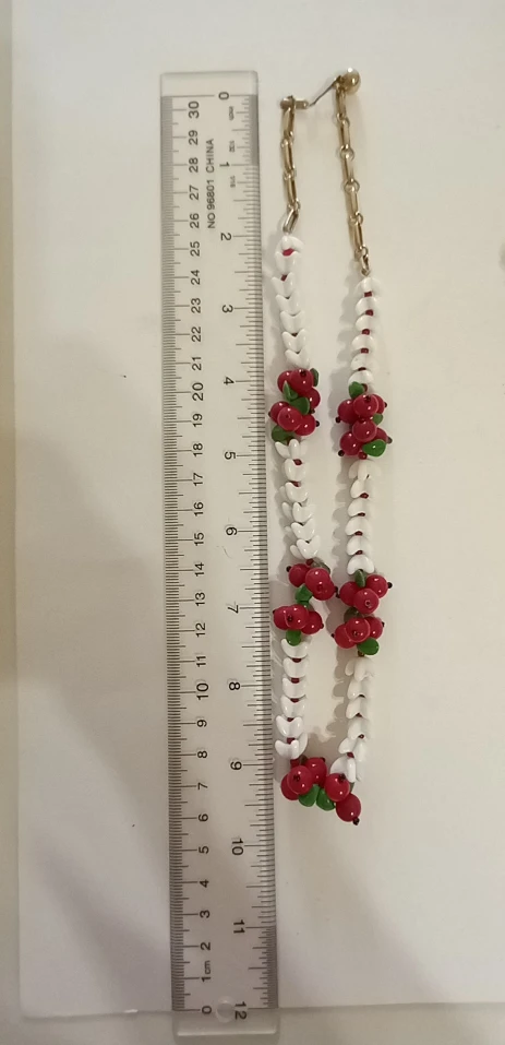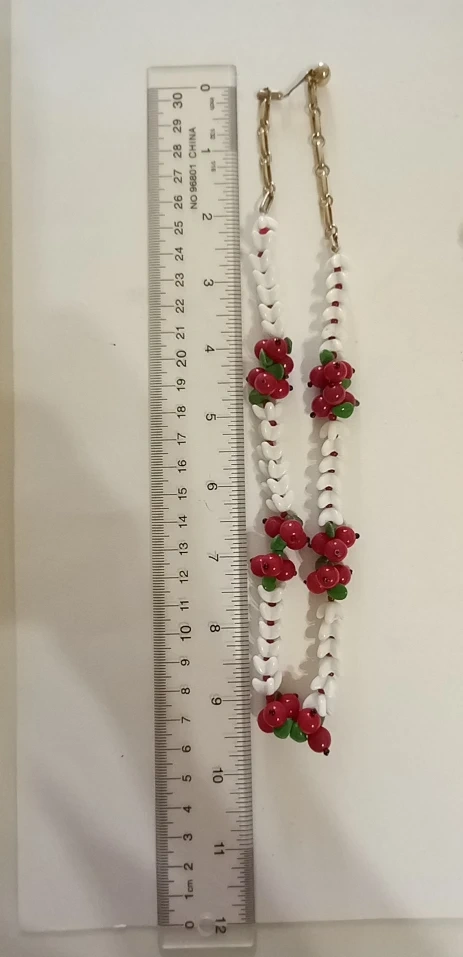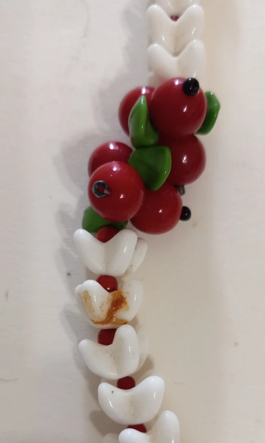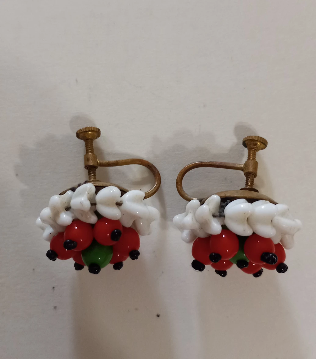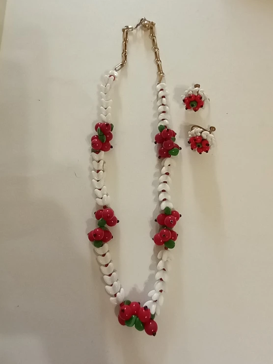 REDUCED Vintage 1950s necklace with matching screw back earrings. white with red berries, i believe it's glass. one white piece has been repaired bit can be hidden to back (see photo)