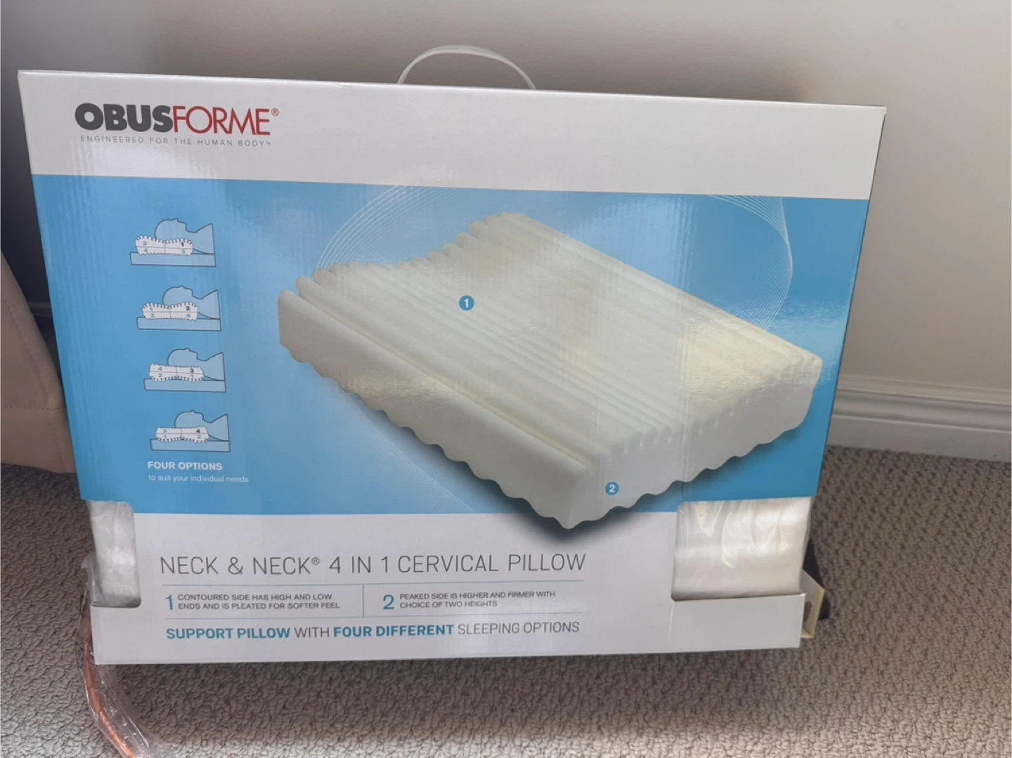 Get a good night's sleep with this ObusForme Neck & Neck 4 in 1 Cervical BRAND NEW Pillow! It features a contoured side with high and low ends pleated for a softer feel, and a peaked side that is higher and firmer with a choice of two heights. The pillow has four different sleeping options to suit your individual needs