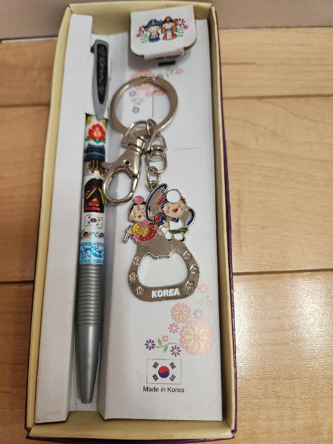 Selling a brand new cute souvenir set from Korea. Includes a pen with traditional Korean designs and a bottle opener keychain featuring traditional Korean figures. The set comes in its original box. Comes from a smoke and pet free home.