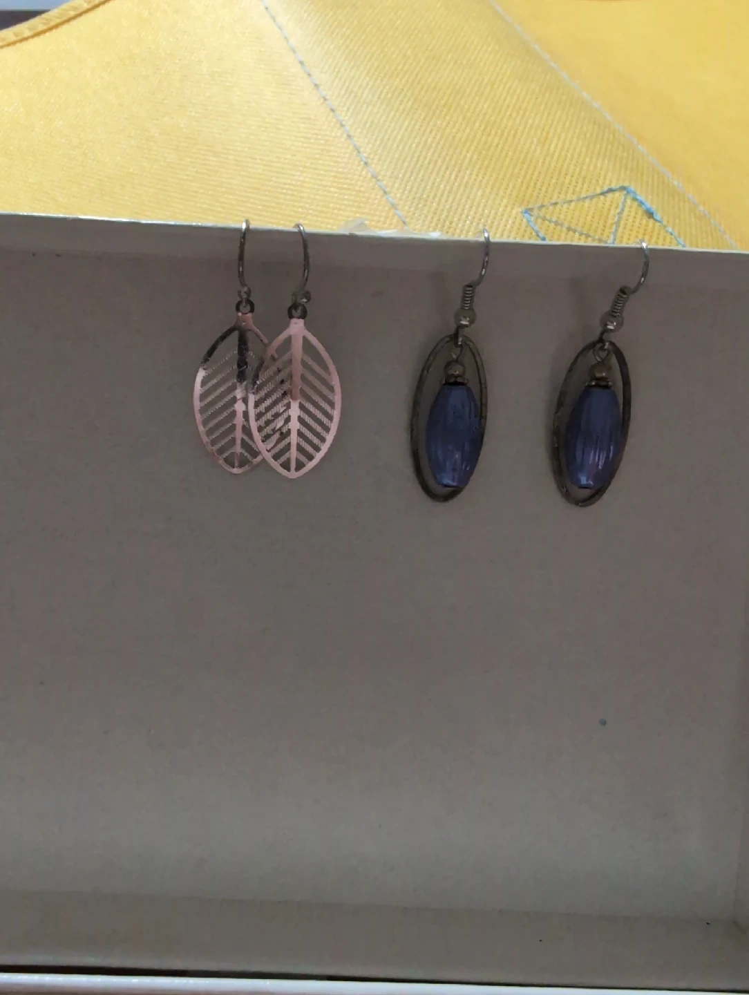 Selling two pair of earrings! One set features a delicate leaf design, and the other has a pretty blue bead. They're in great condition and ready to add a touch of style to any outfit $2 each