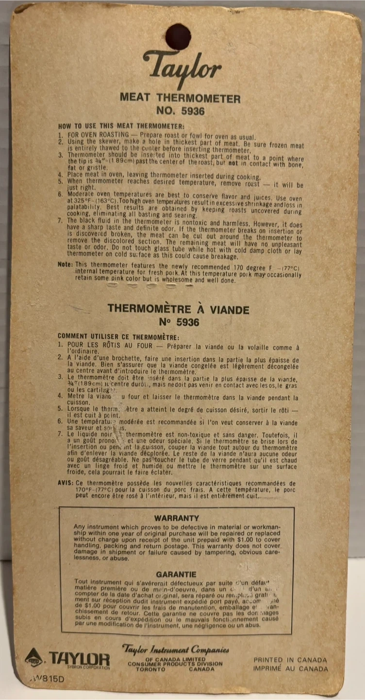 Vintage 1969’s Taylor Meat Thermometer No. 5936 - Sealed