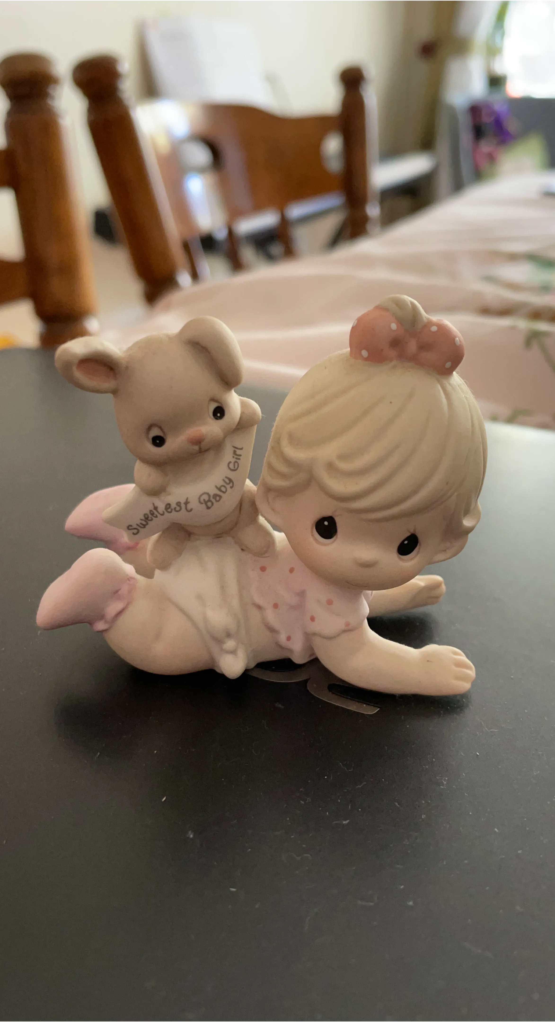 This is a Precious Moments figurine of a baby girl with a bunny on her back. The bunny is holding a sign that says "Sweetest Baby Girl". It is in good condition and would be a lovely addition to any collection!