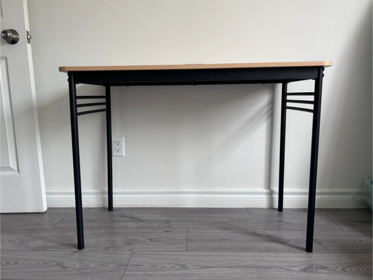 Selling a simple desk with a wood top and black metal legs. It's in great shape and perfect for a small workspace or student. The desk is sturdy and has a clean, minimalist design that would fit well in any room. It's easy to assemble and disassemble, making it convenient to move around if needed