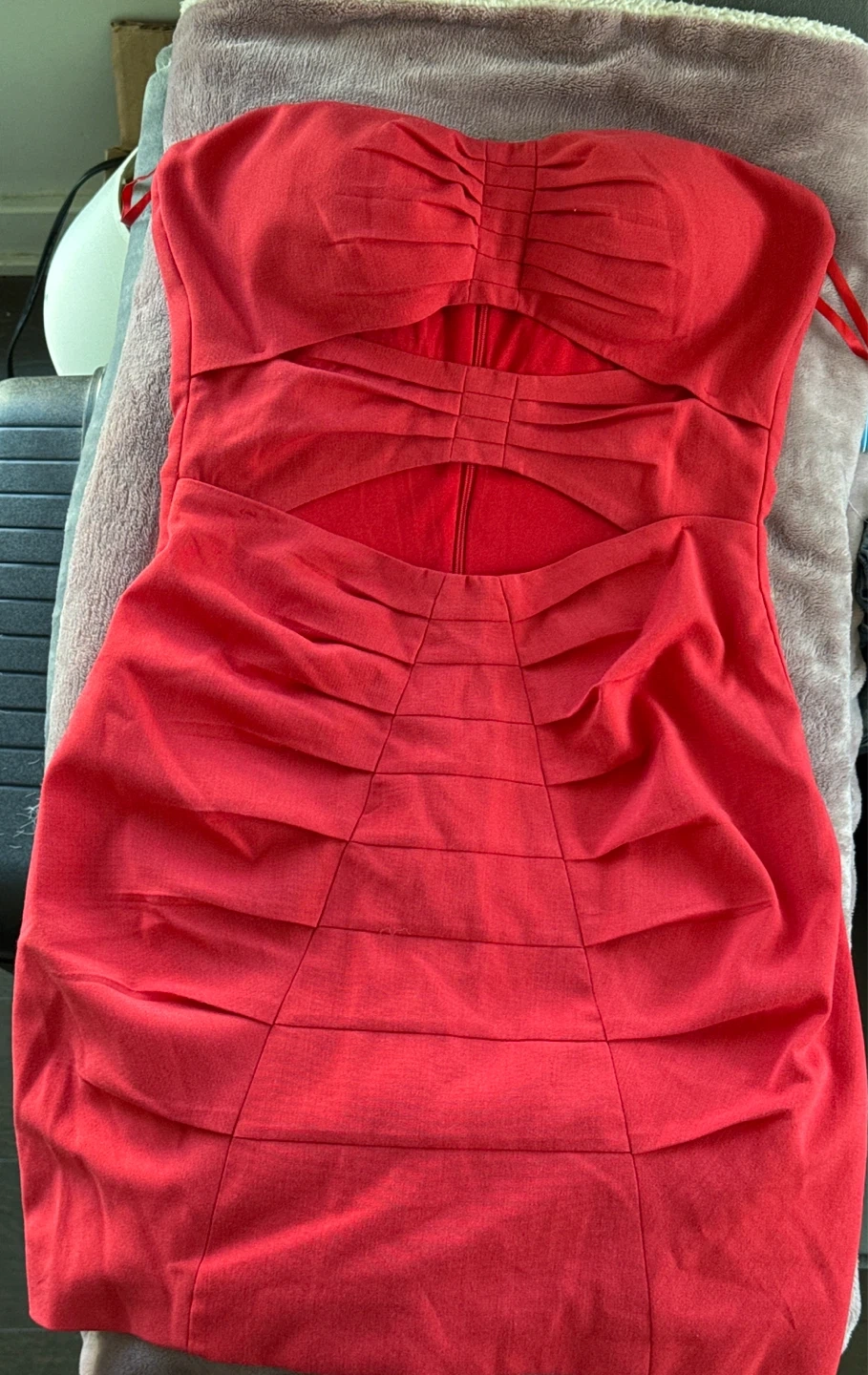 Coral strapless dress with a fitted silhouette and a unique cut-out design! Perfect for a night out or a special occasion! It's in great condition and ready for a new home