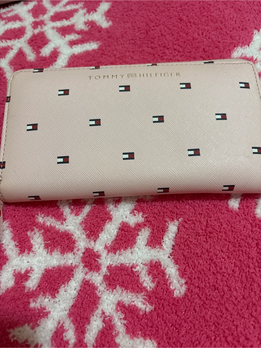 65Tommy Hilfiger wallet in a light pink colour with the brand's logo pattern all over. The interior is navy blue and has lots of space for cards and cash. It's in great condition!