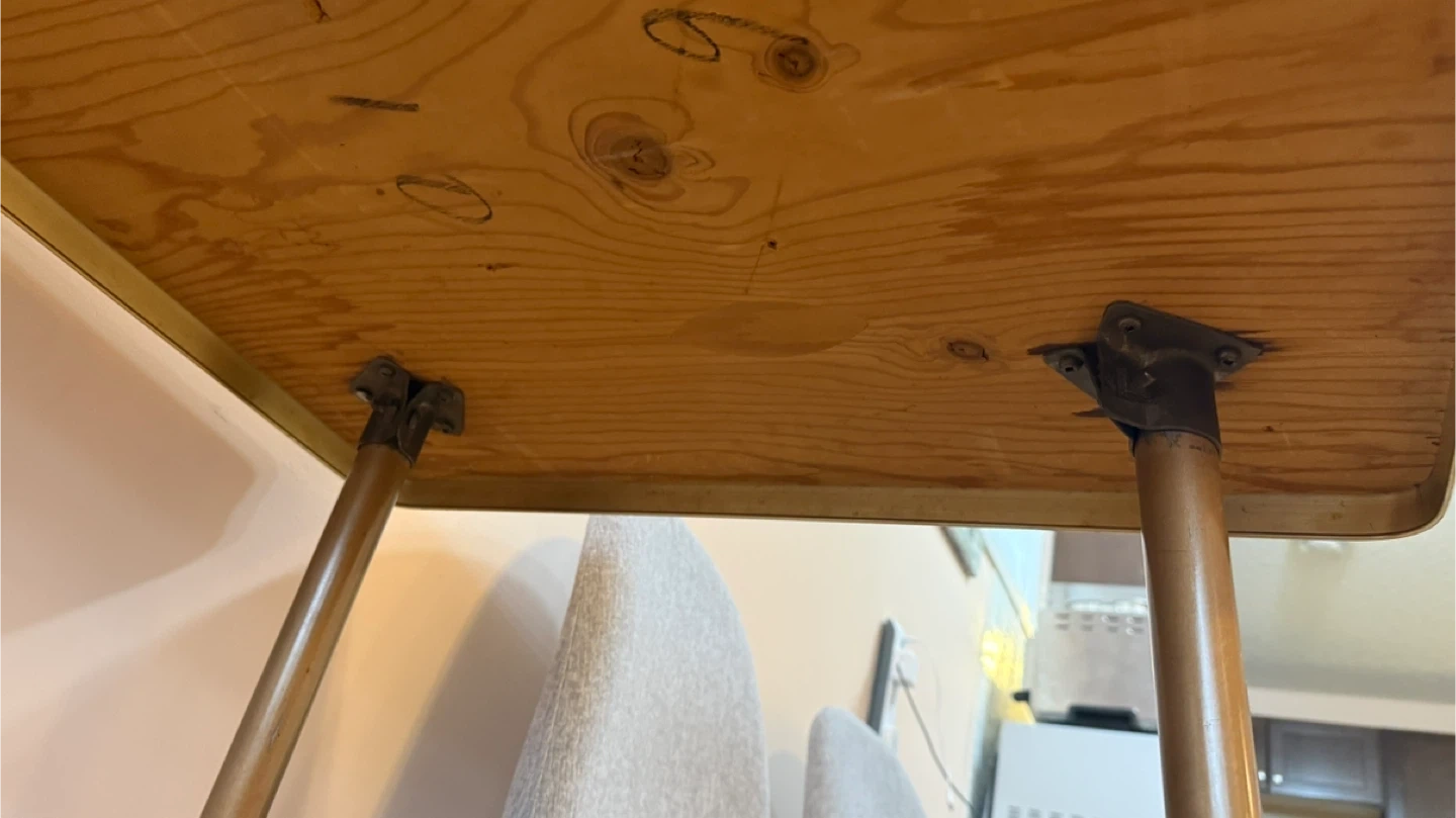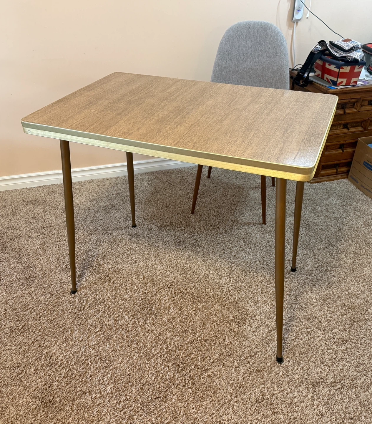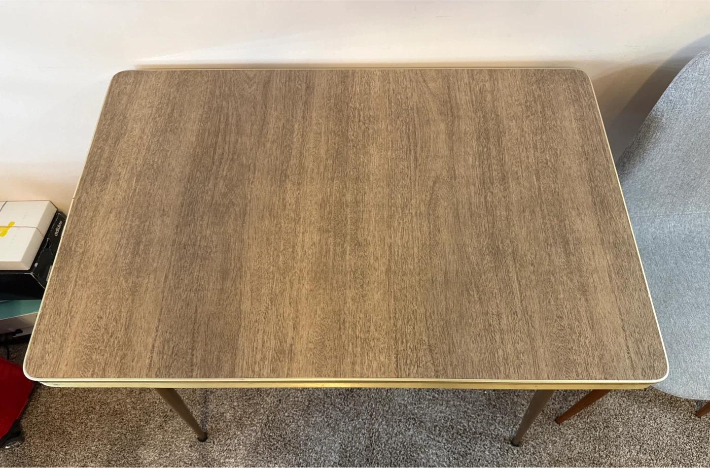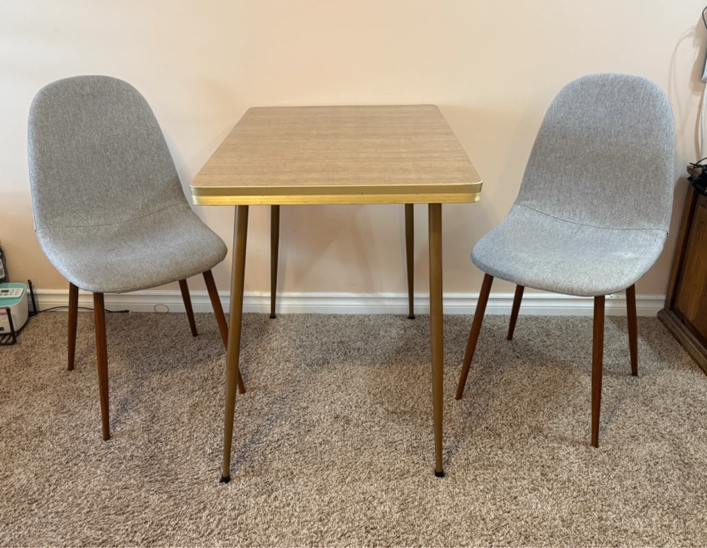 Selling a cute vintage dining table from 70s. It features a wood-look top with a gold trim and slender, tapered legs. Perfect for a small dining area or kitchen nook! The pair of grey upholstery dining chairs are also available at $30.