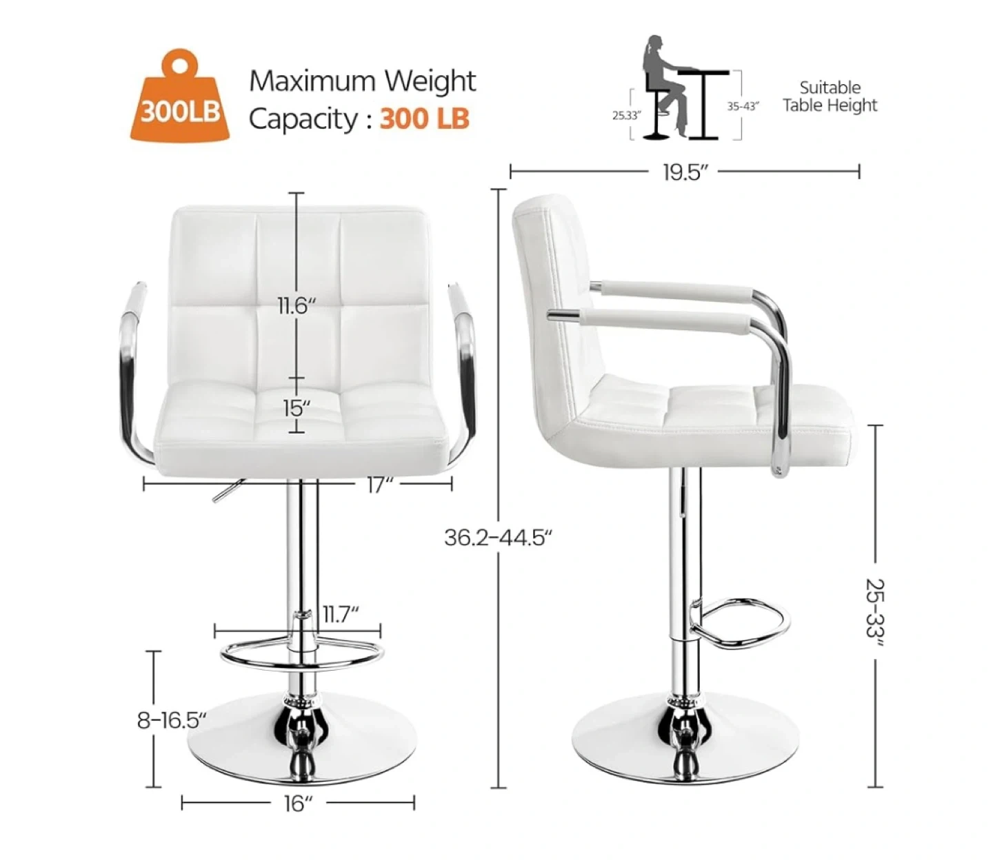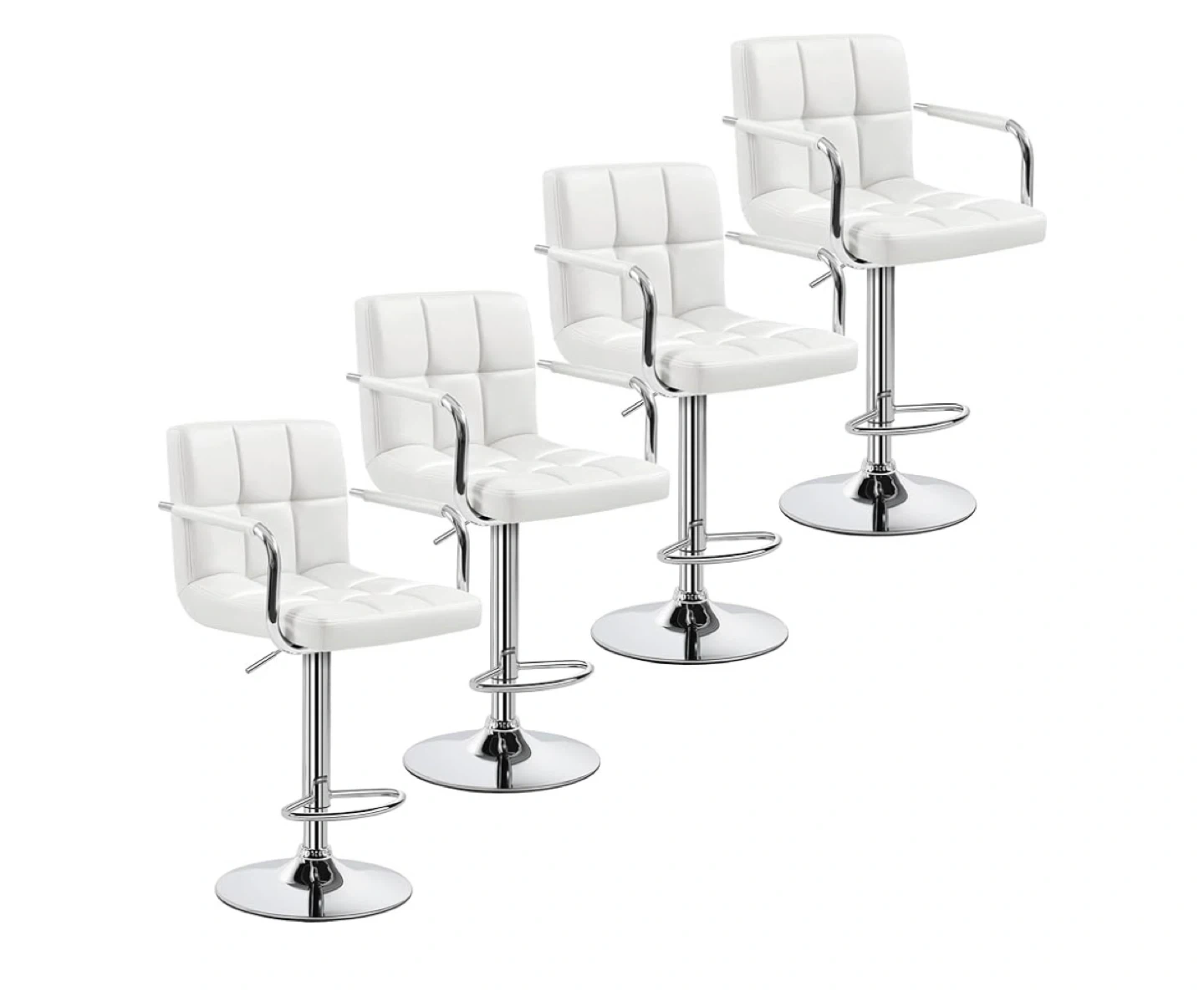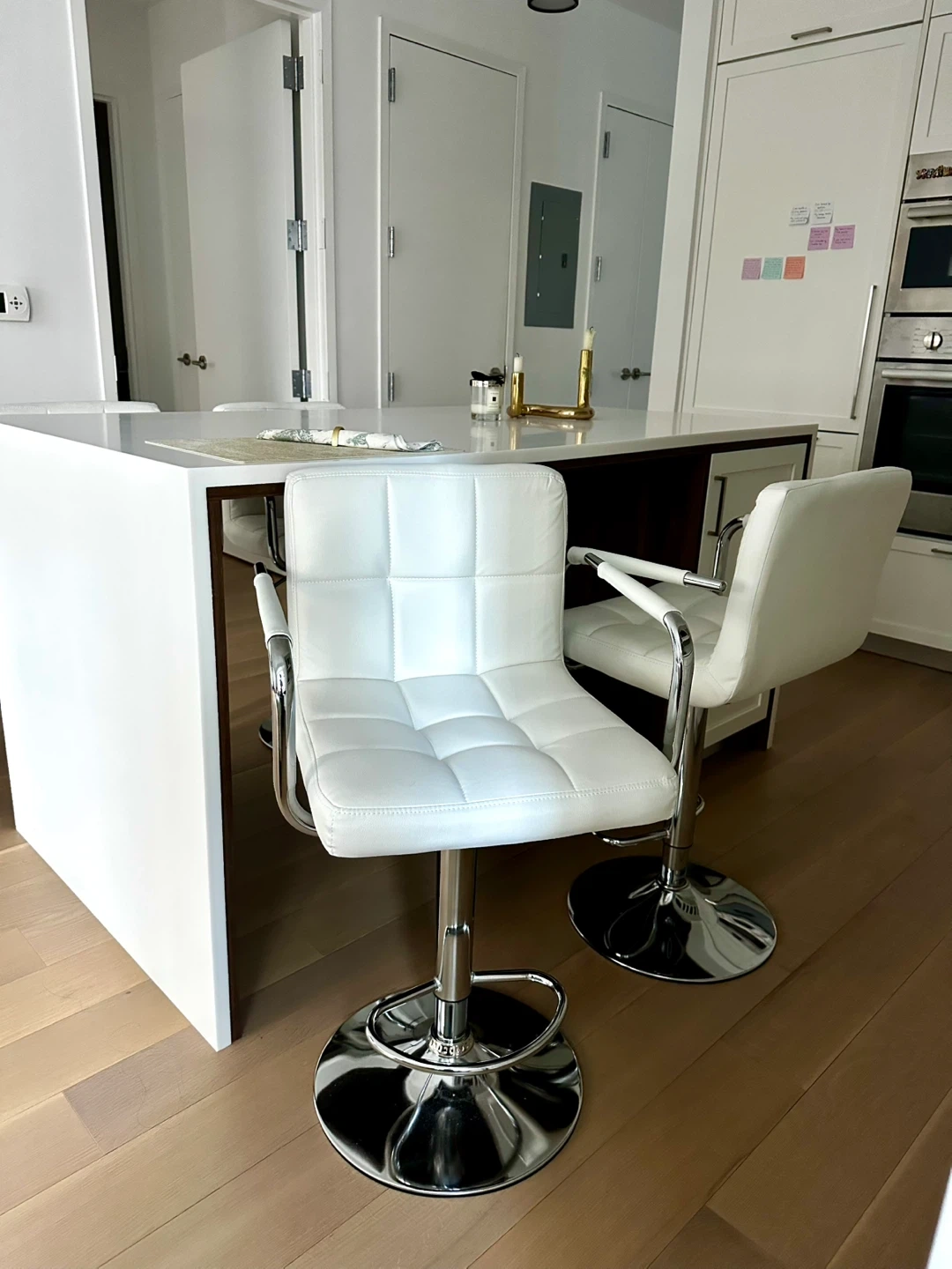 Selling a set of four white adjustable bar stools. The seat height is adjustable from 25 to 33 inches, making them suitable for various counter heights. Super comfortable!! Bought just few months ago, so they are in perfect conditions