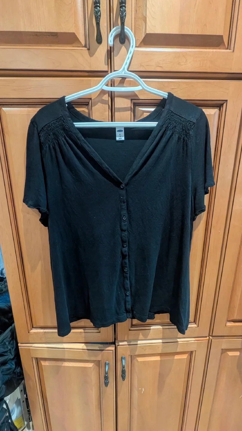 114Selling a gently used black button-up top from Old Navy! It's a size XL and in great condition except like most Old Navy shirts it has shrunk a bit. Perfect for a casual look or dressing up a bit