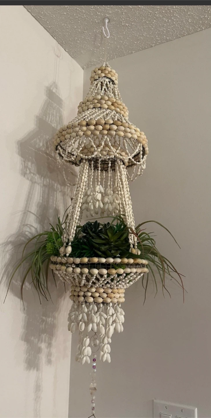 60This is a unique hanging planter made from seashells. It's perfect for adding a coastal or bohemian touch to your home decor. It's in great condition and ready to hang with your favourite plants