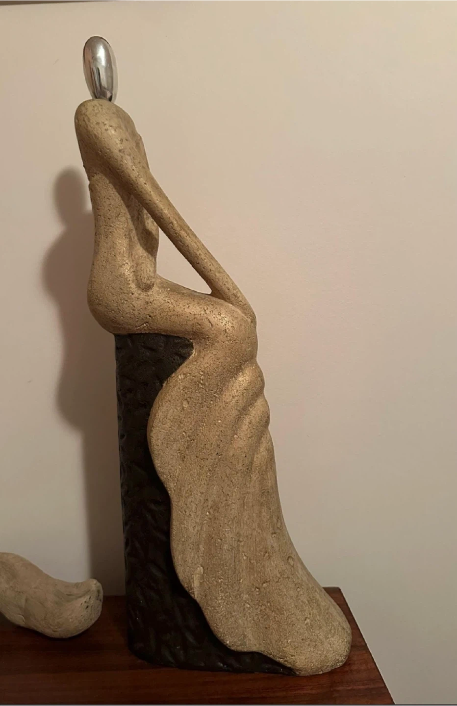 Unique abstract sculpture featuring a seated figure. The sculpture has a textured, sandy finish and a striking silver accent on the head. It would make a great addition to any art collection or home decor