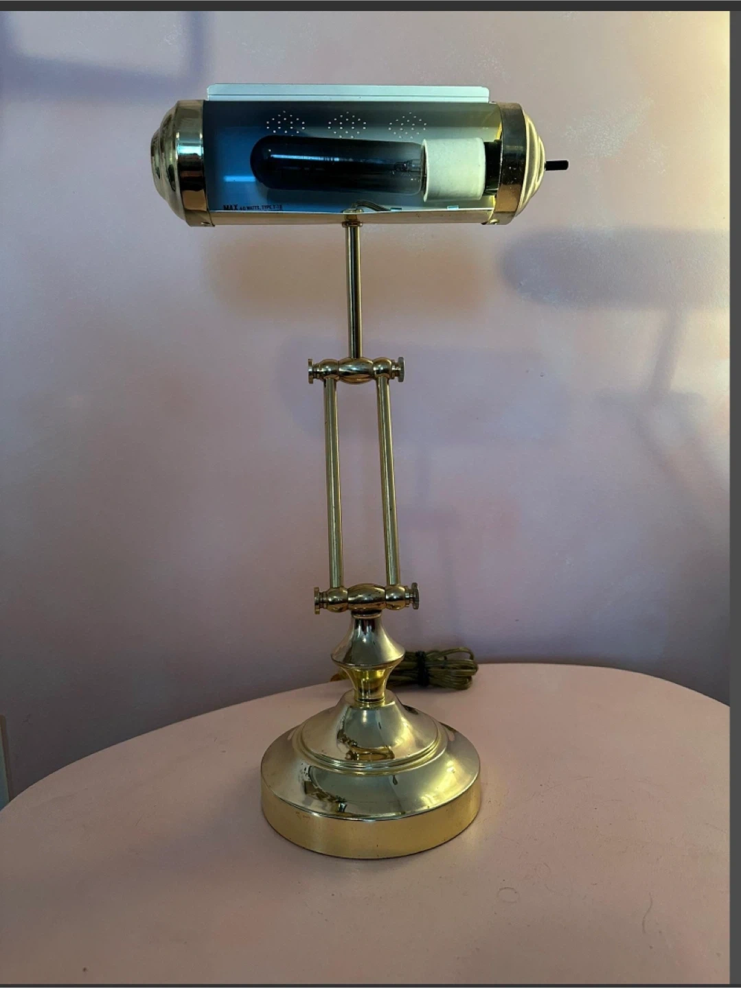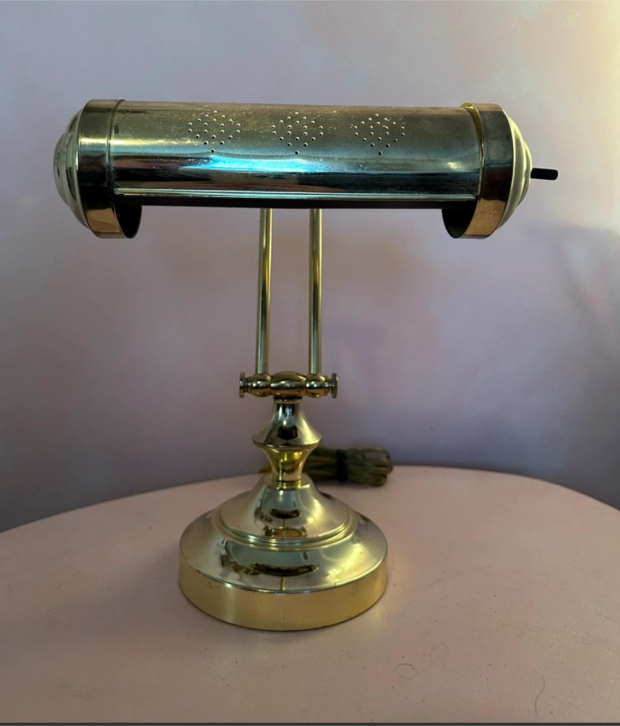 Selling a beautiful vintage brass banker's lamp! It's in great condition and would add a touch of classic elegance to any desk or room. The lamp features an adjustable arm and a sturdy base. It has some minor signs of wear but nothing major. Great for a home office or study space