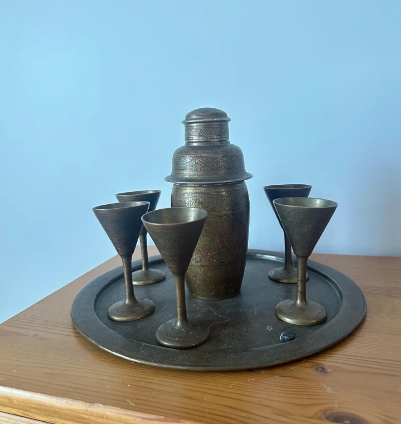 Selling a beautiful vintage brass cocktail shaker set! It includes a shaker, a tray, and six matching glasses. The set has intricate floral and geometric patterns etched into the brass. It's a stunning piece that would add a touch of vintage charm to any home bar or collection