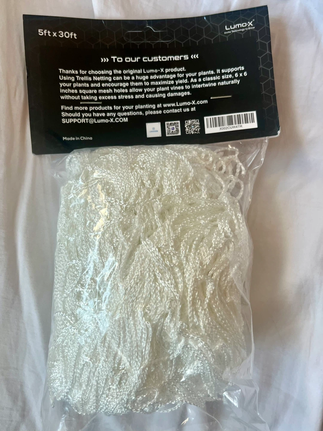 1000+I'm selling a brand new package of Lumo-X Trellis Netting! It measures 5ft x 30ft. It's made of durable polyester nylon and is designed to be heavy-duty for supporting your plants. It has a soft and smooth texture, helping your plant vines intertwine naturally without causing stress or damage Pickup downtown and cash only!