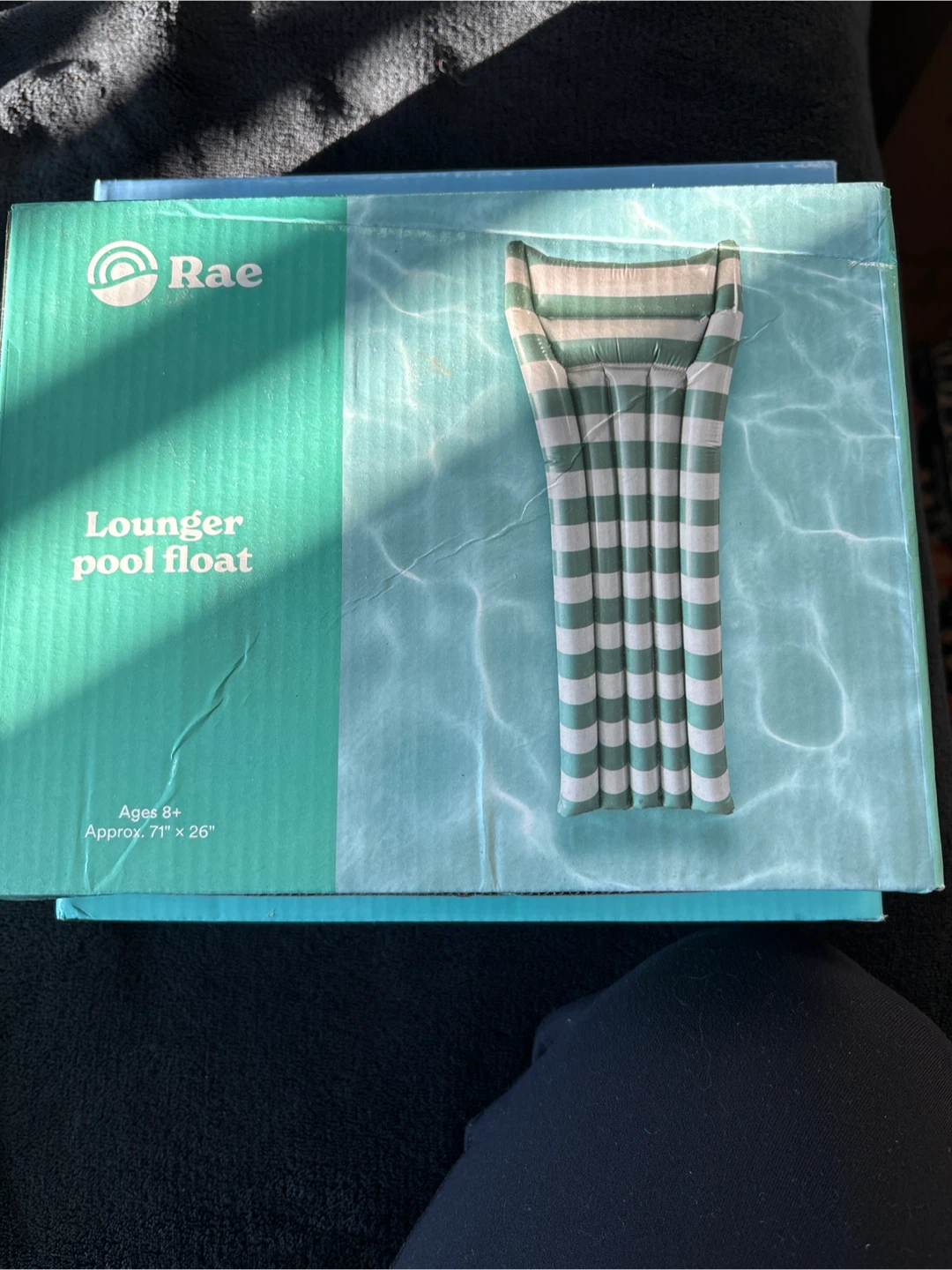 Selling a Rae lounger pool float, perfect for relaxing in the water this summer! It's designed for ages 8 and up, and it's approximately 71" x 26". Comes in the original box