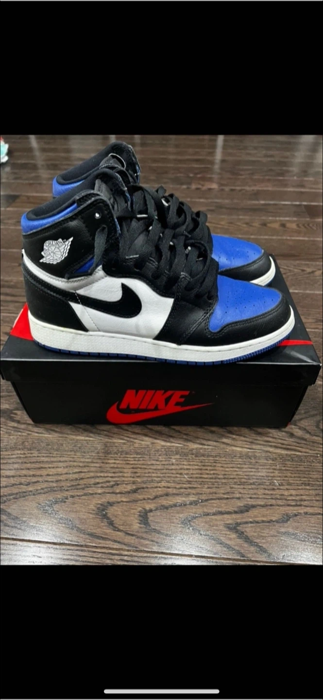 18Selling a pair of Nike Air Jordan 1 Retro High sneakers in size 6 Youth. They come with the original box! The shoes feature a blue, black, and white colourway, great for adding a pop of colour to any outfit