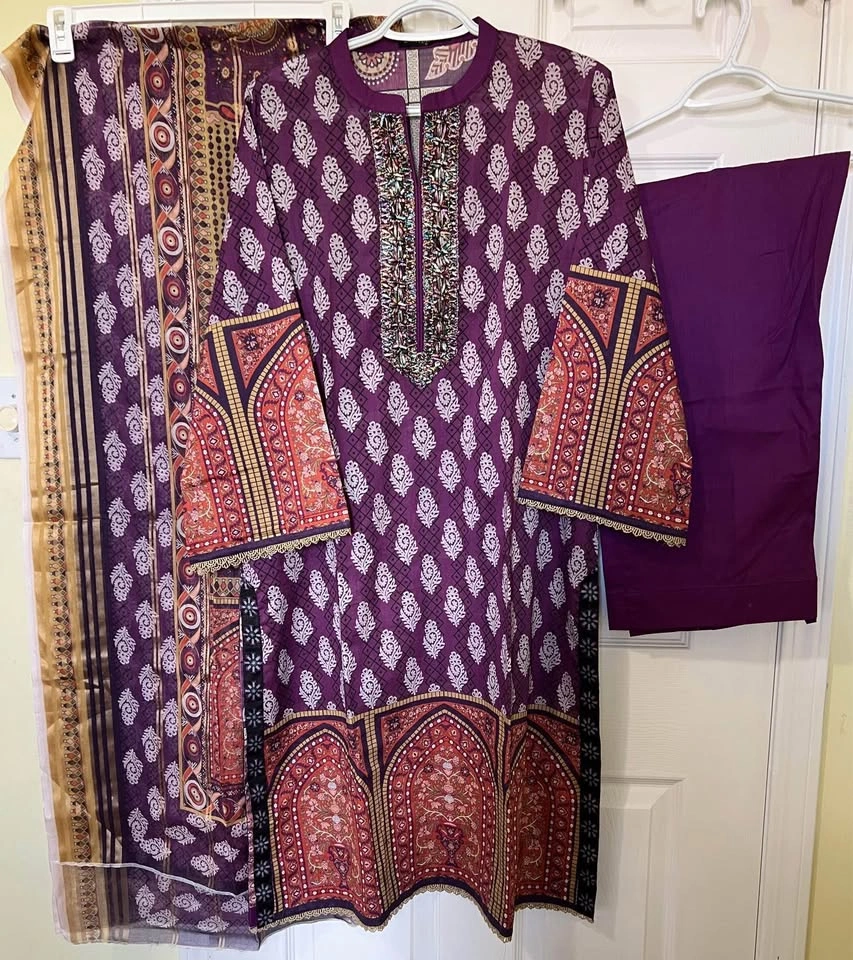10It's a beautiful 3pcs Pakistani lawn purple Suit with lace work and beautiful Dupatta. It's brand New. Size :Large. Price: $45 Order Now send a messages