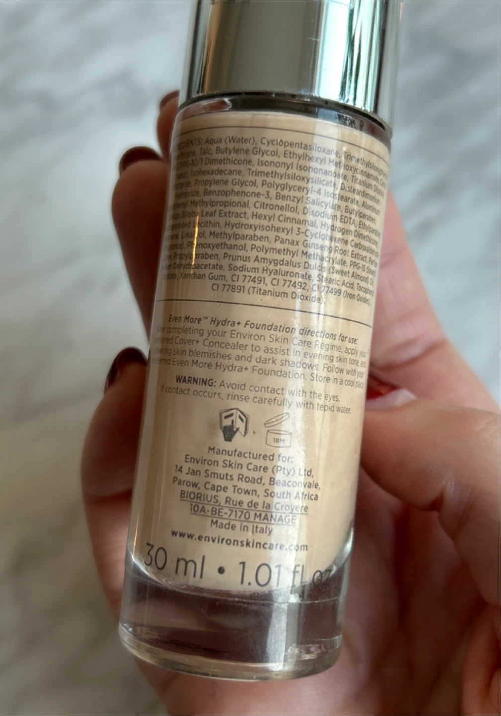 Environ Even More Hydra+ Foundation 1 is a lightweight foundation that provides even coverage to assist in evening skin tone and covering concealer to assist in covering skin tone and covering blemishes and dark shadows