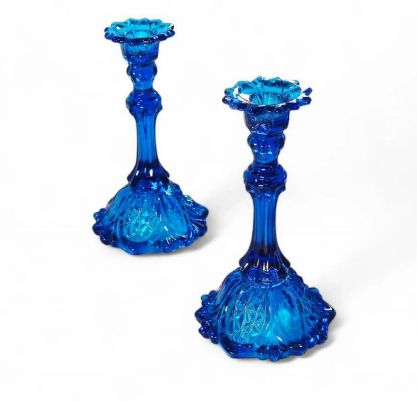 60Here's a beautiful pair of vintage blue glass candlestick holders! They're in great condition and would add a lovely touch to any room. The intricate design and vibrant blue colour make them a real eye-catcher