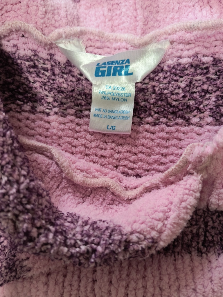 Cozy La Senza Girl sweater in a cute pink and purple striped pattern! It's a size L/G and made of a soft blend of 74% polyester and 26% nylon. Perfect for staying warm and stylish. Large size for teens but small for adults.