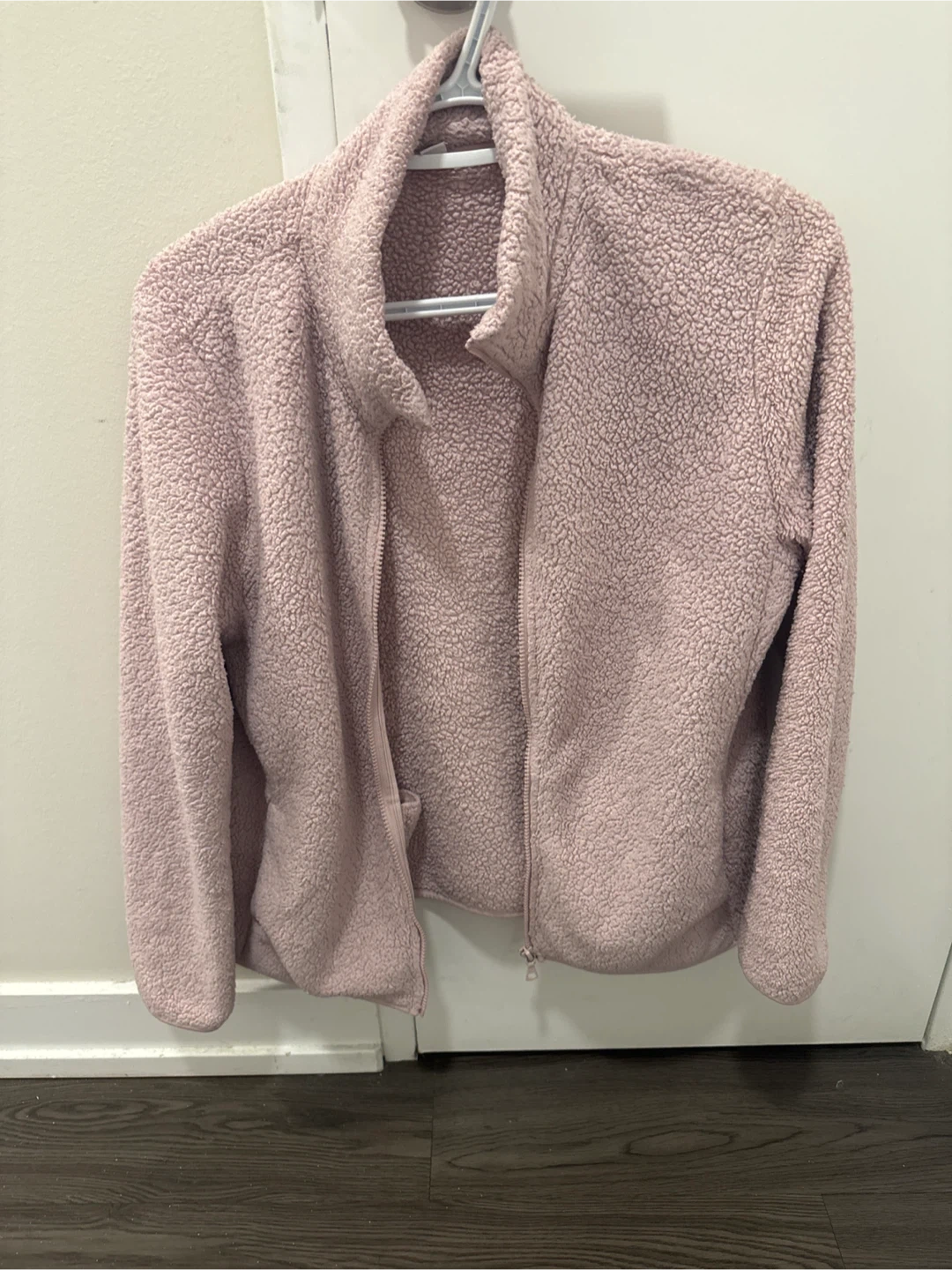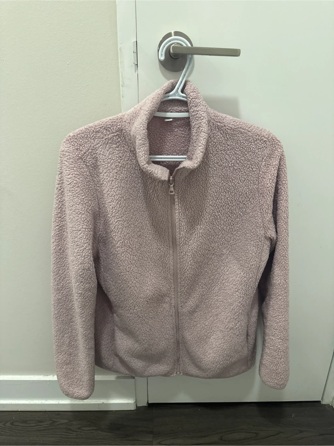 779Cozy up with this Uniqlo fluffy yarn fleece jacket! It's a lovely light pink colour and a size large. Perfect for layering or just lounging around the house. This jacket is in great condition and ready for a new home!