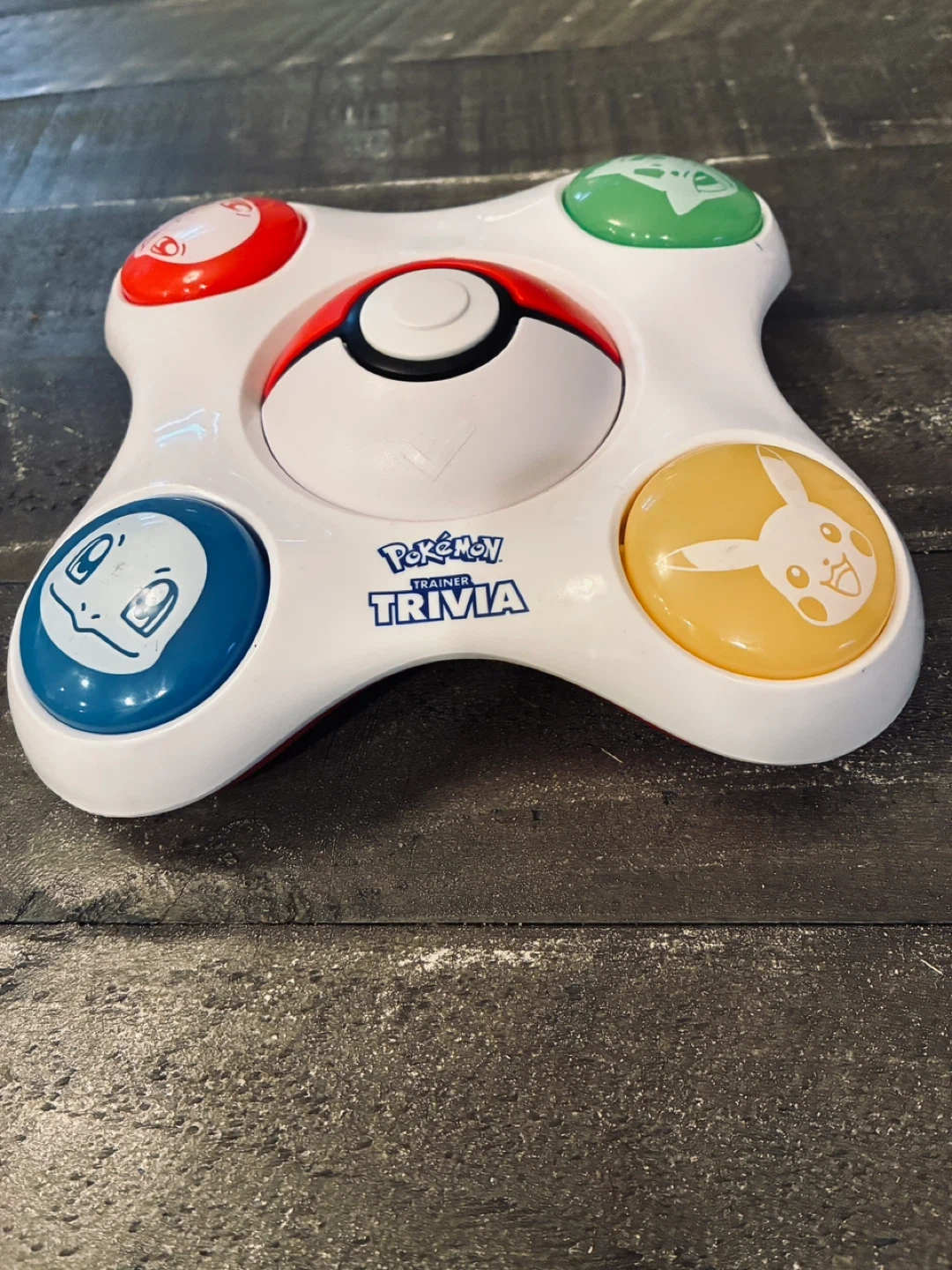 Selling a Pokémon Trainer Trivia game! It features a Pokeball button in the middle and four buttons with different Pokémon characters (Pikachu, Bulbasaur, Squirtle, and Charmander) on them. Great for any Pokémon fan! Comes with working batteries