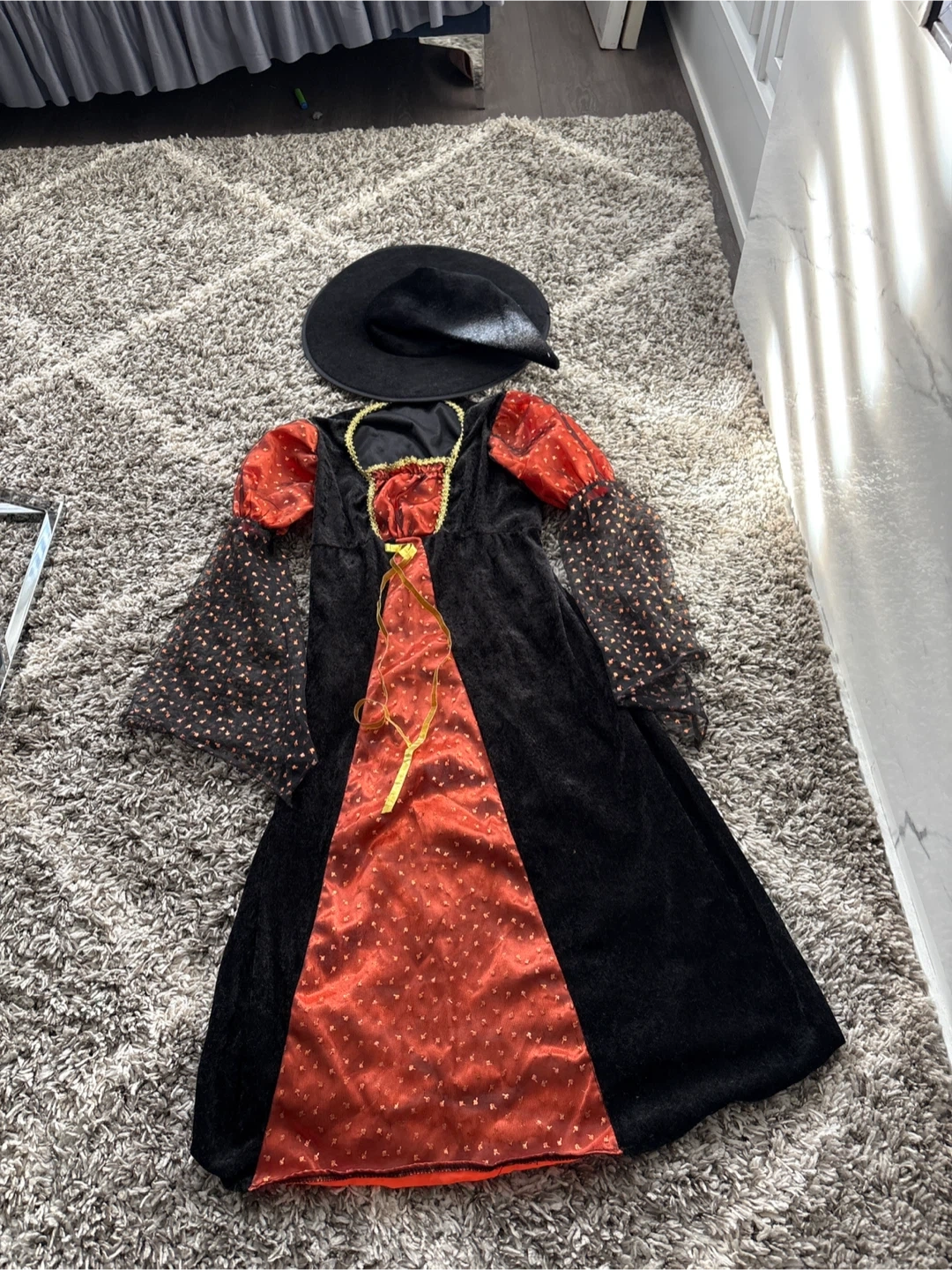 A cute witch costume, perfect for Halloween! It comes with the dress and matching hating it is a perfect witch costume you can use it for more then just a witch it is in great shape it is 9 to 10