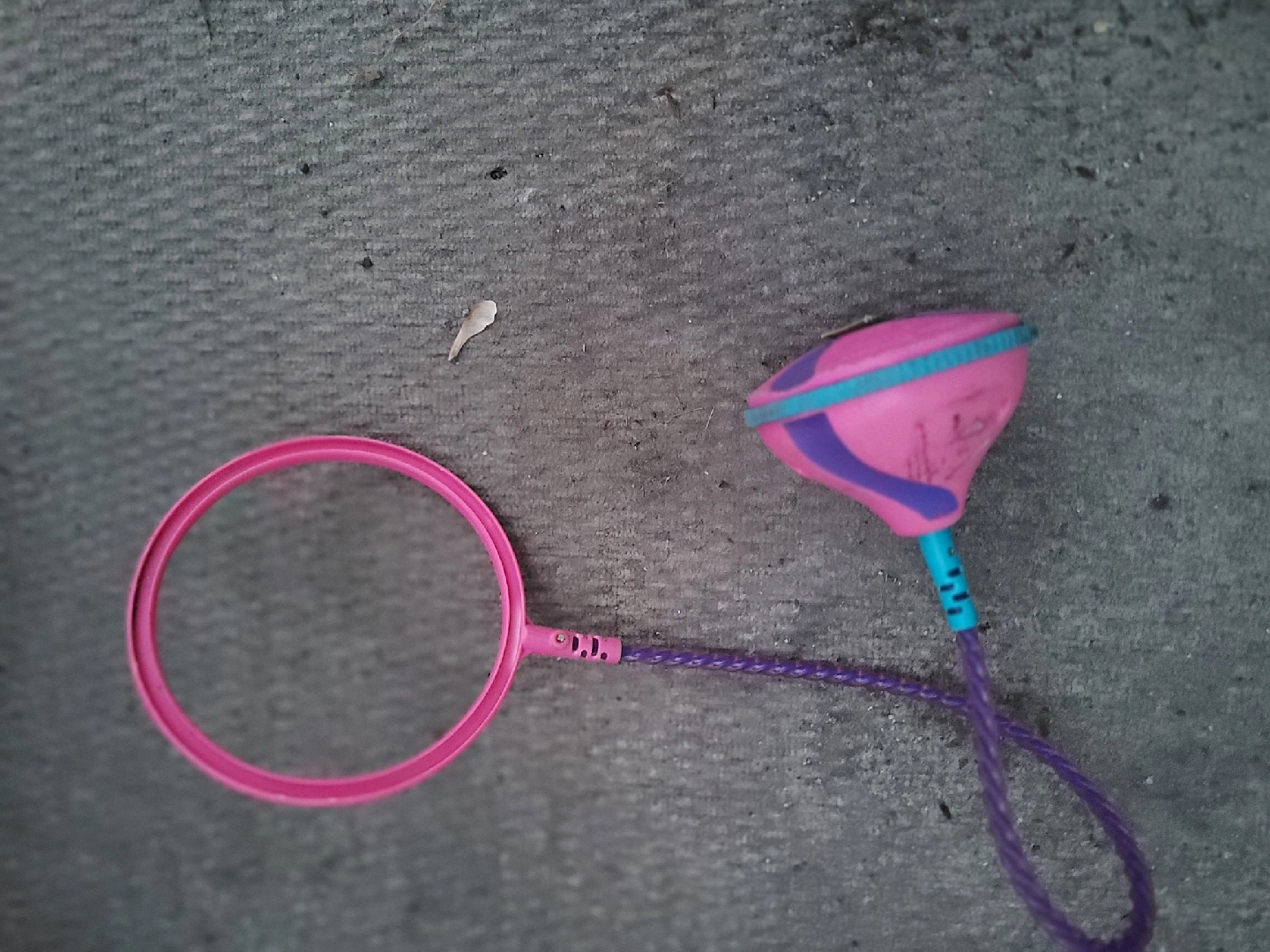 Get ready to twist and skip with this classic Skip-It ankle toy, featuring a pink and purple design and a durable construction for hours of active fun. This item is used, but remains in good condition and is ready to provide hours of entertainment.