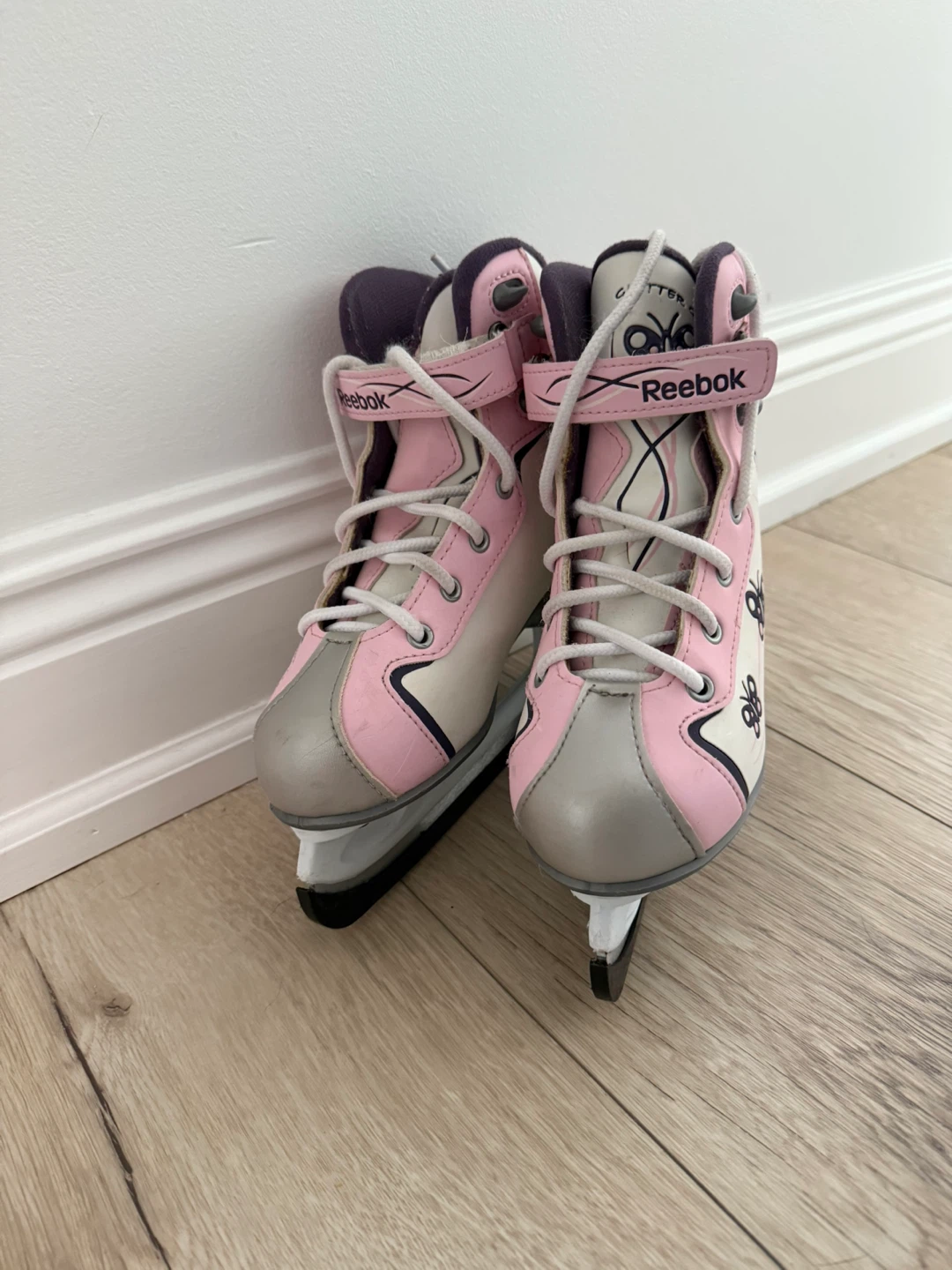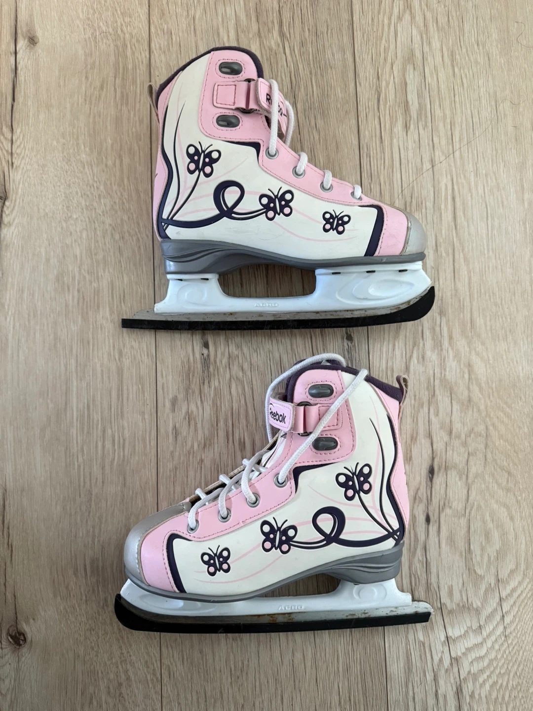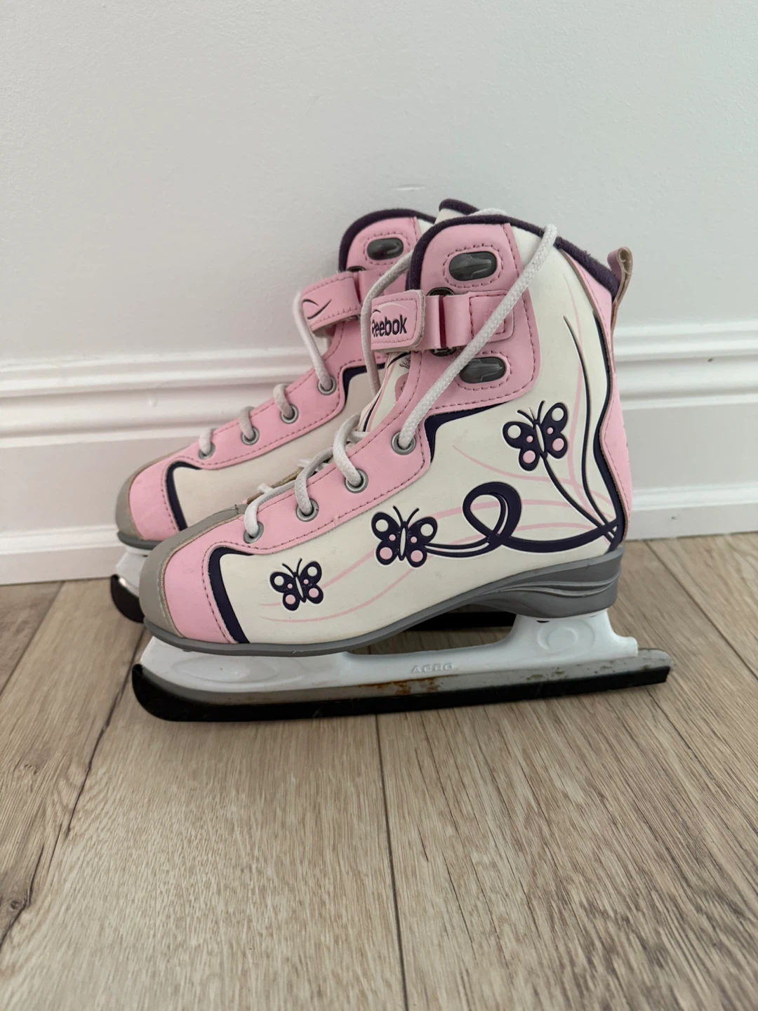 Selling a pair of Reebok girl's ice skates in size 2. They are pink, white and grey with a butterfly design. Perfect for the rink!