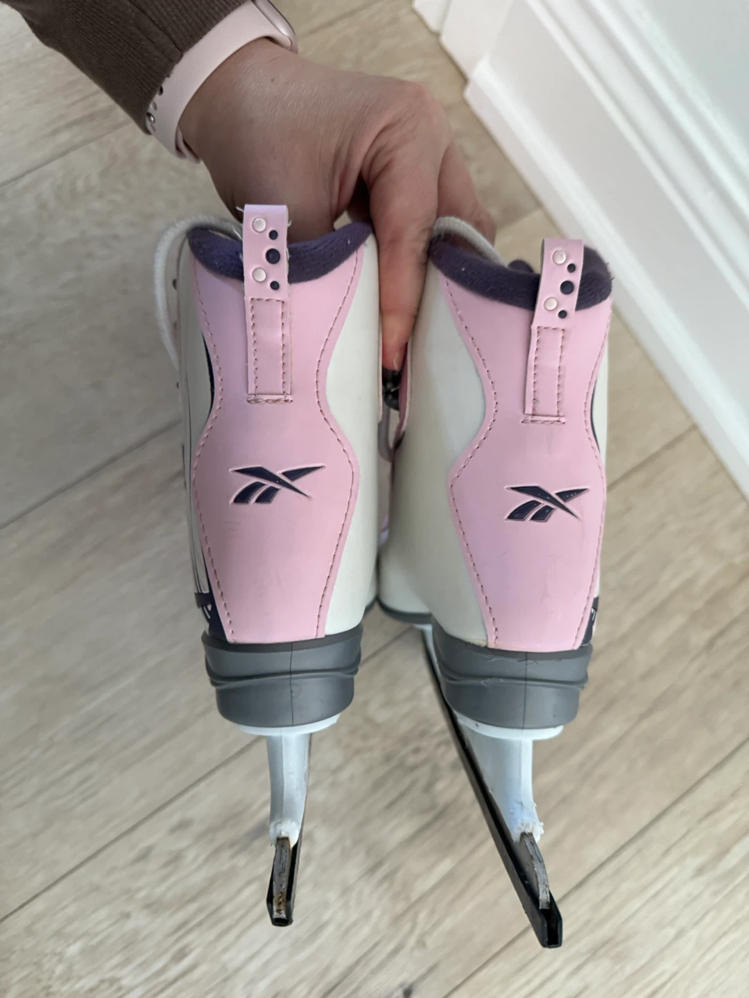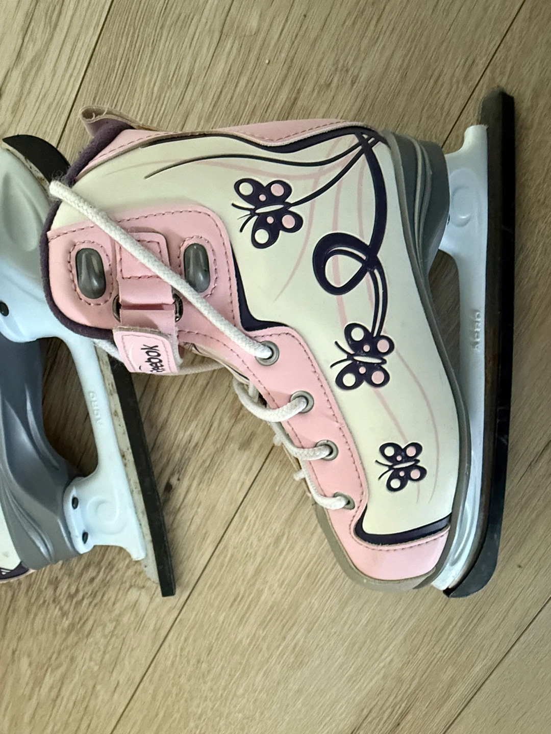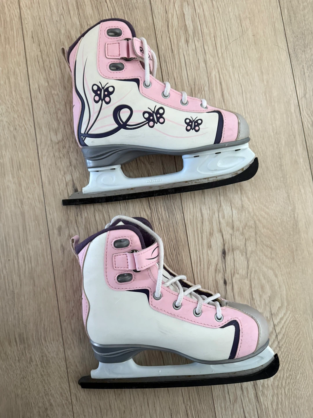 Selling a pair of Reebok girl's ice skates in size 2. They are pink, white and grey with a butterfly design. Perfect for the rink!