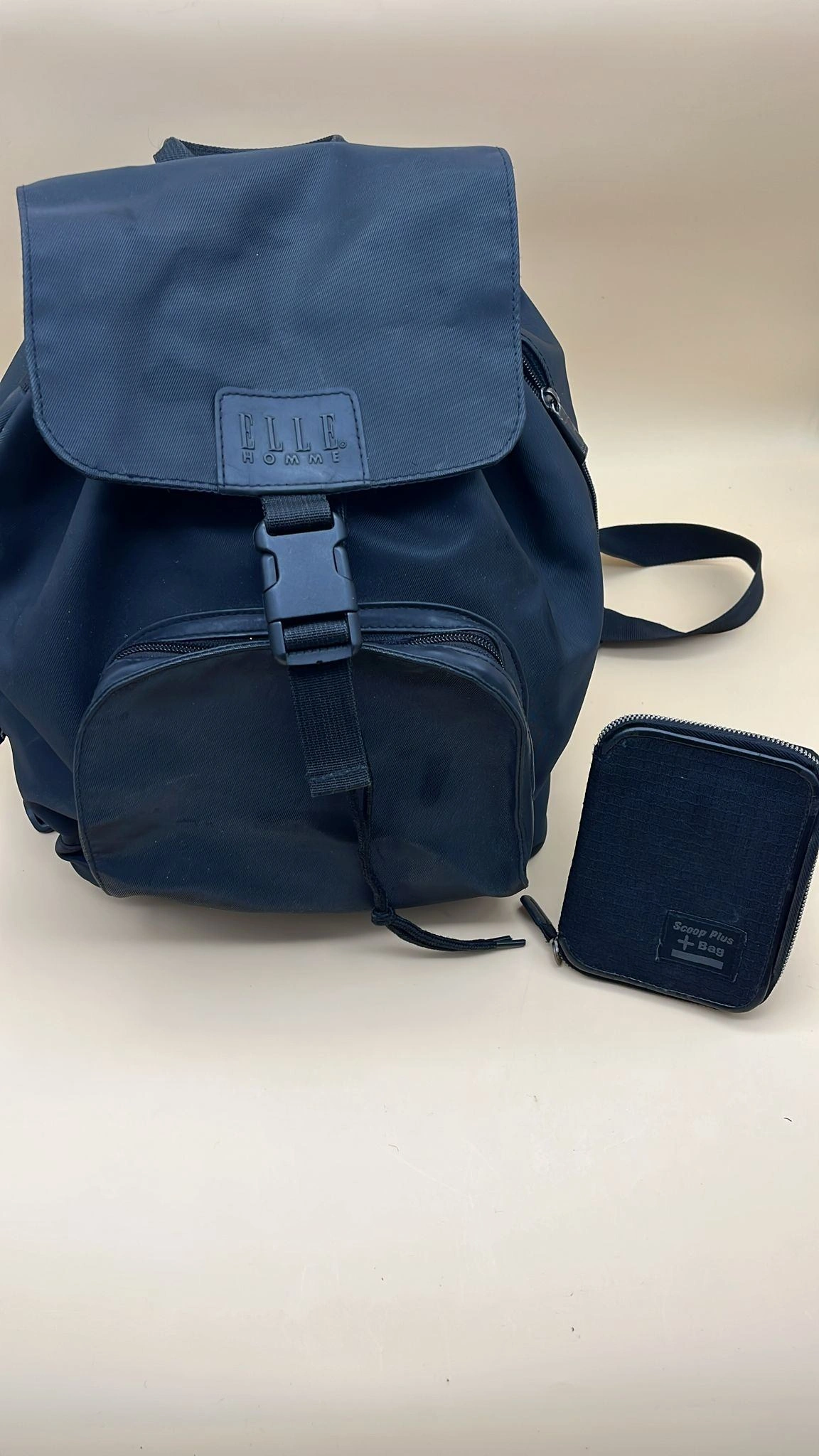 54ELLE Homme backpack with adjustable padded straps, front zip pocket, and logo branding—compact, durable nylon for everyday adventures. Comes with a matching small black pouch for essentials.