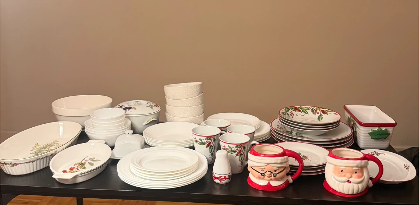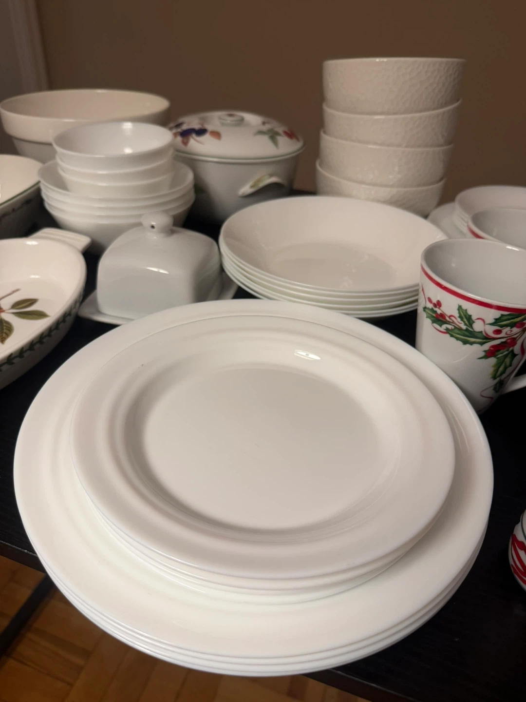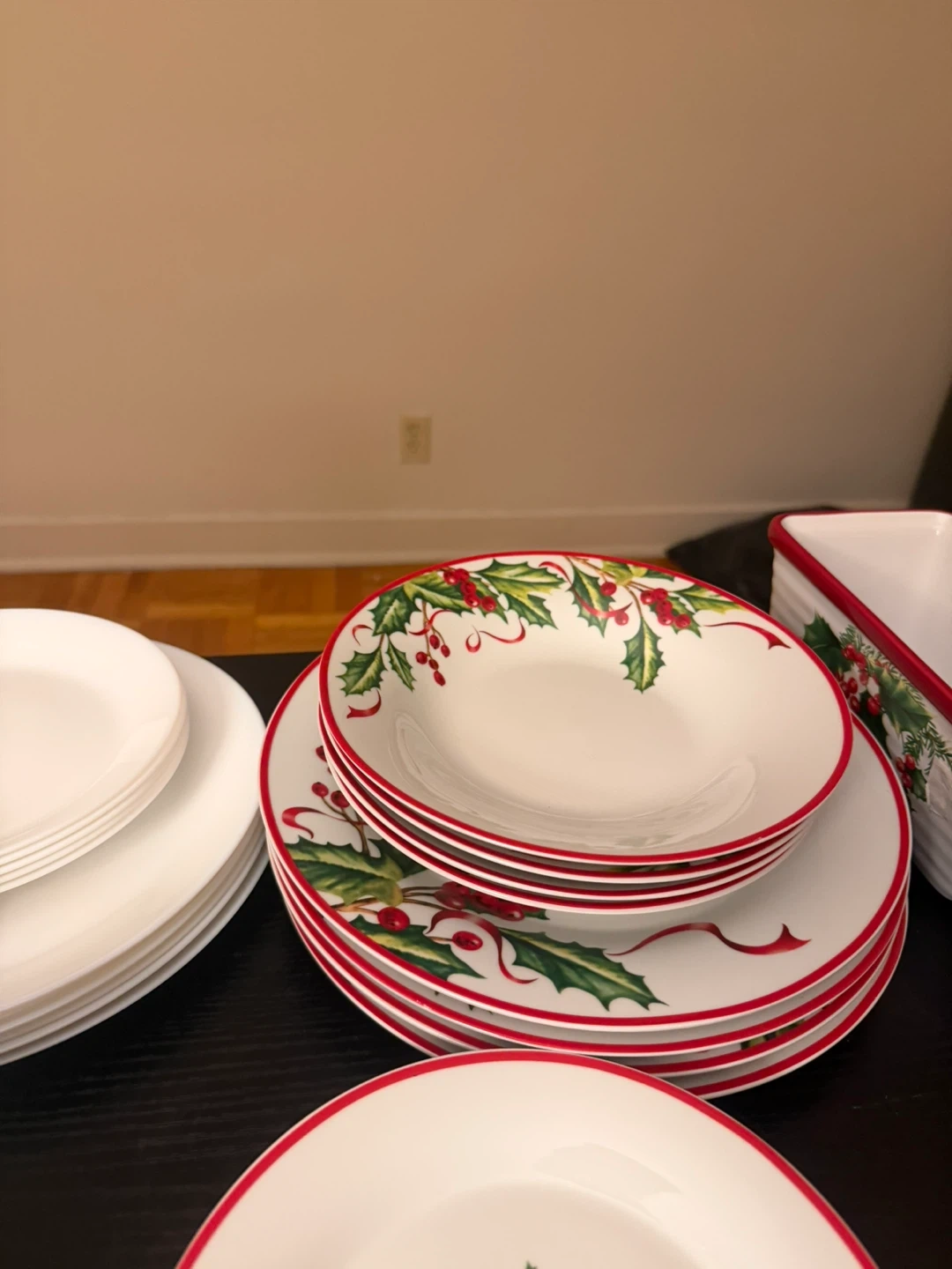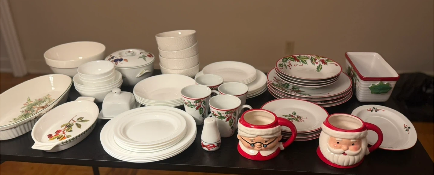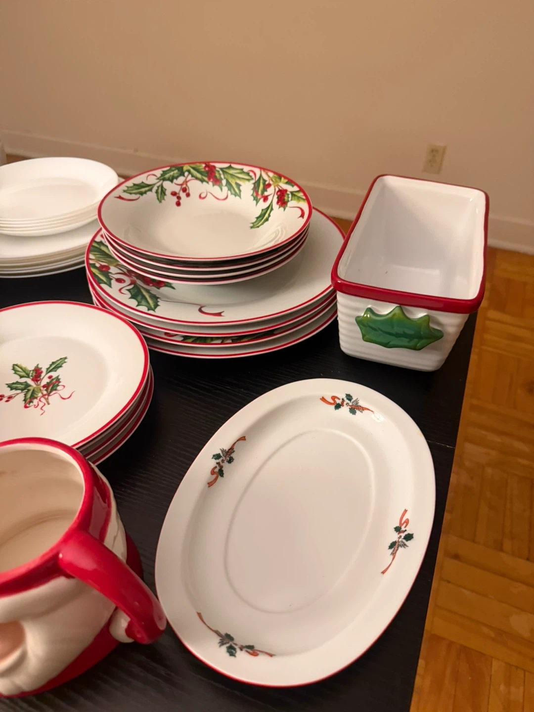 75Selling a large dinnerware set! Includes plates, bowls, mugs, and serving dishes. Great for everyday use or special occasions. Some pieces have a festive holiday design, and others are plain white. Lots of pieces in good condition!