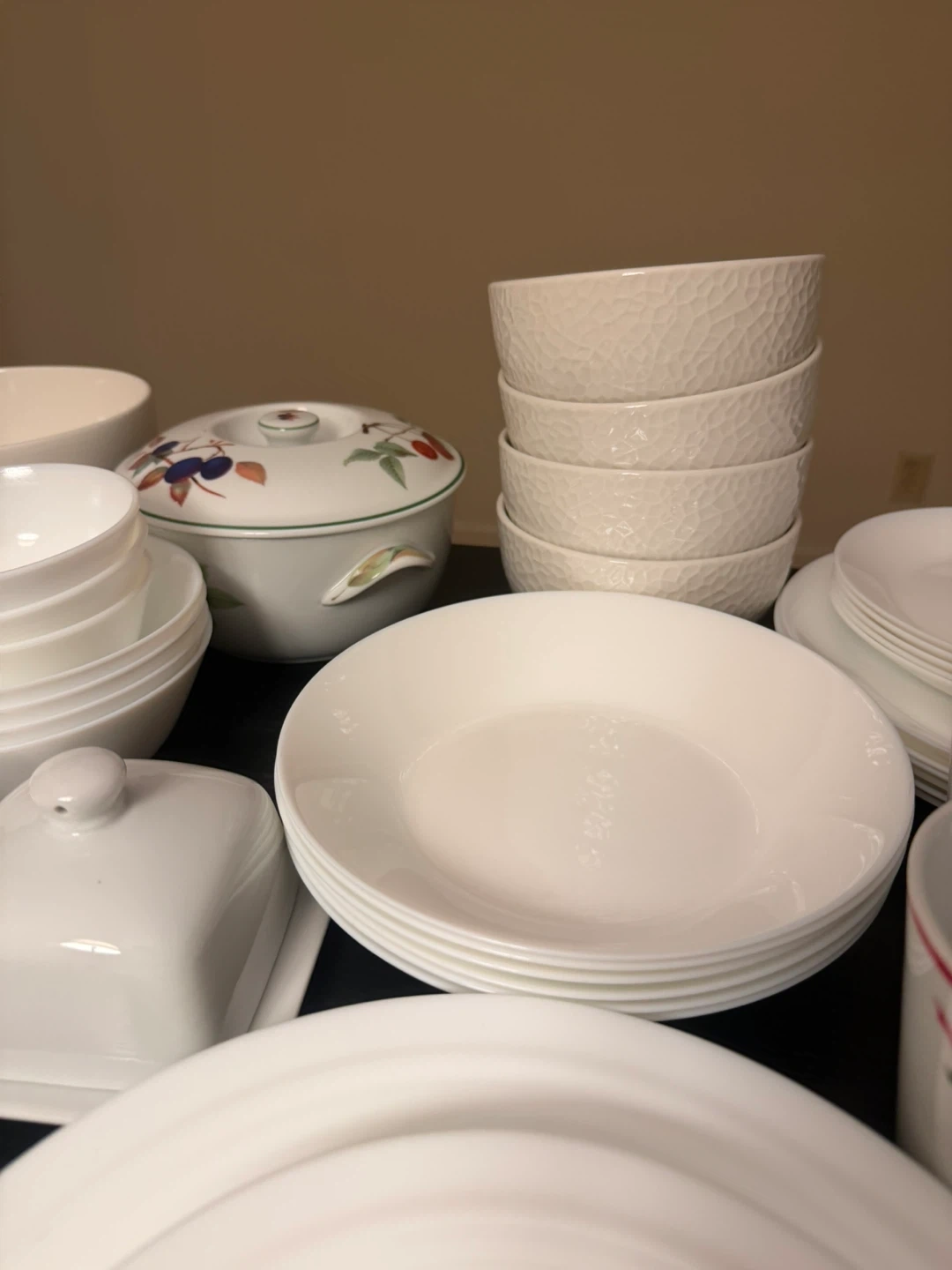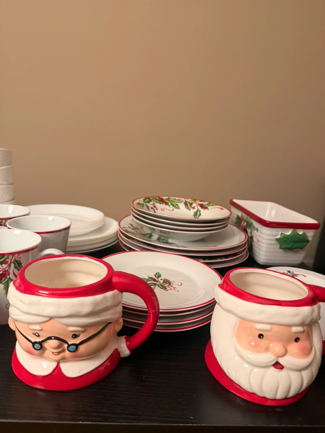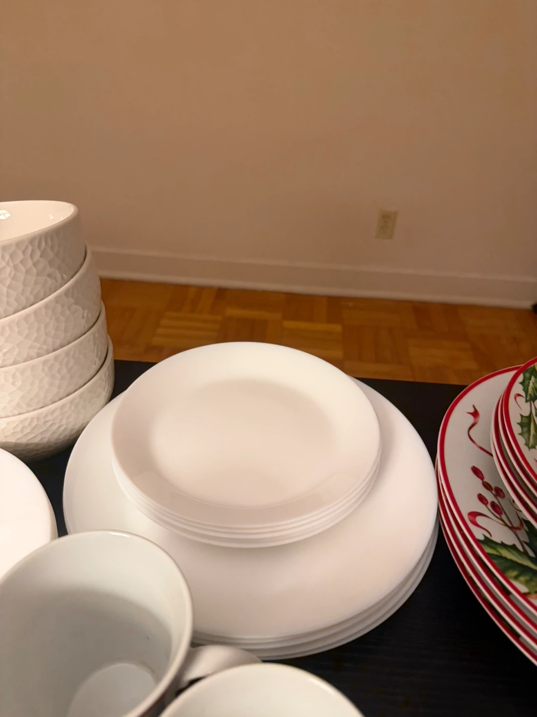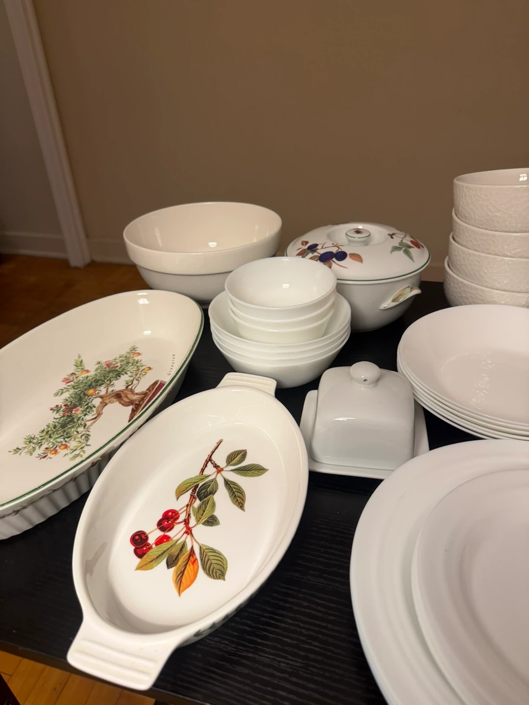 75Selling a large dinnerware set! Includes plates, bowls, mugs, and serving dishes. Great for everyday use or special occasions. Some pieces have a festive holiday design, and others are plain white. Lots of pieces in good condition!