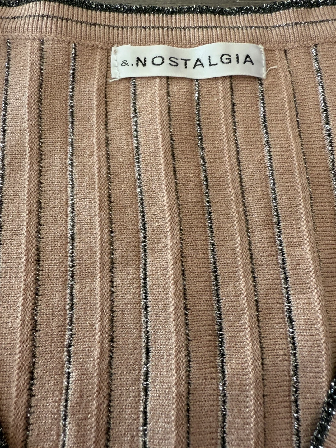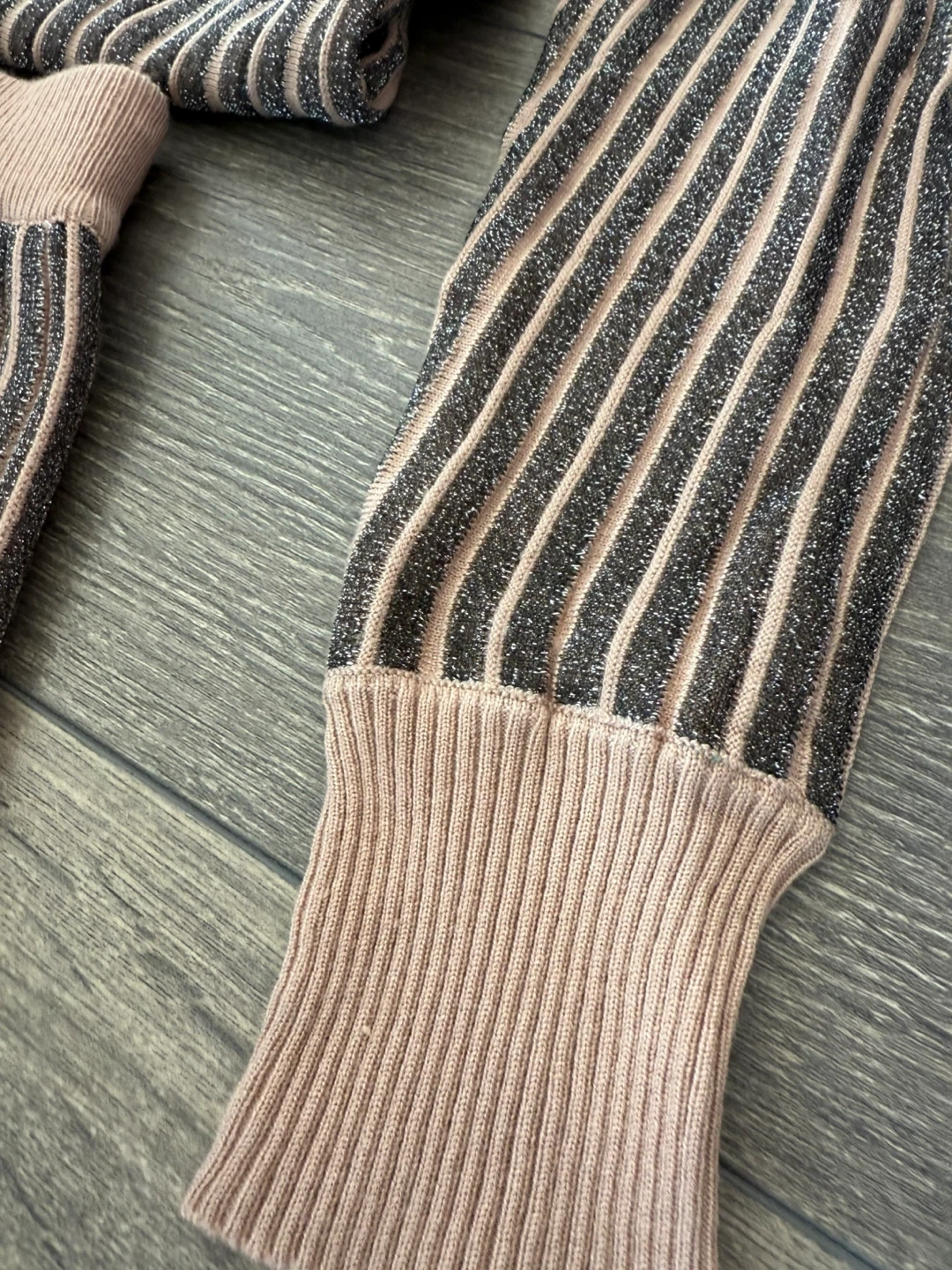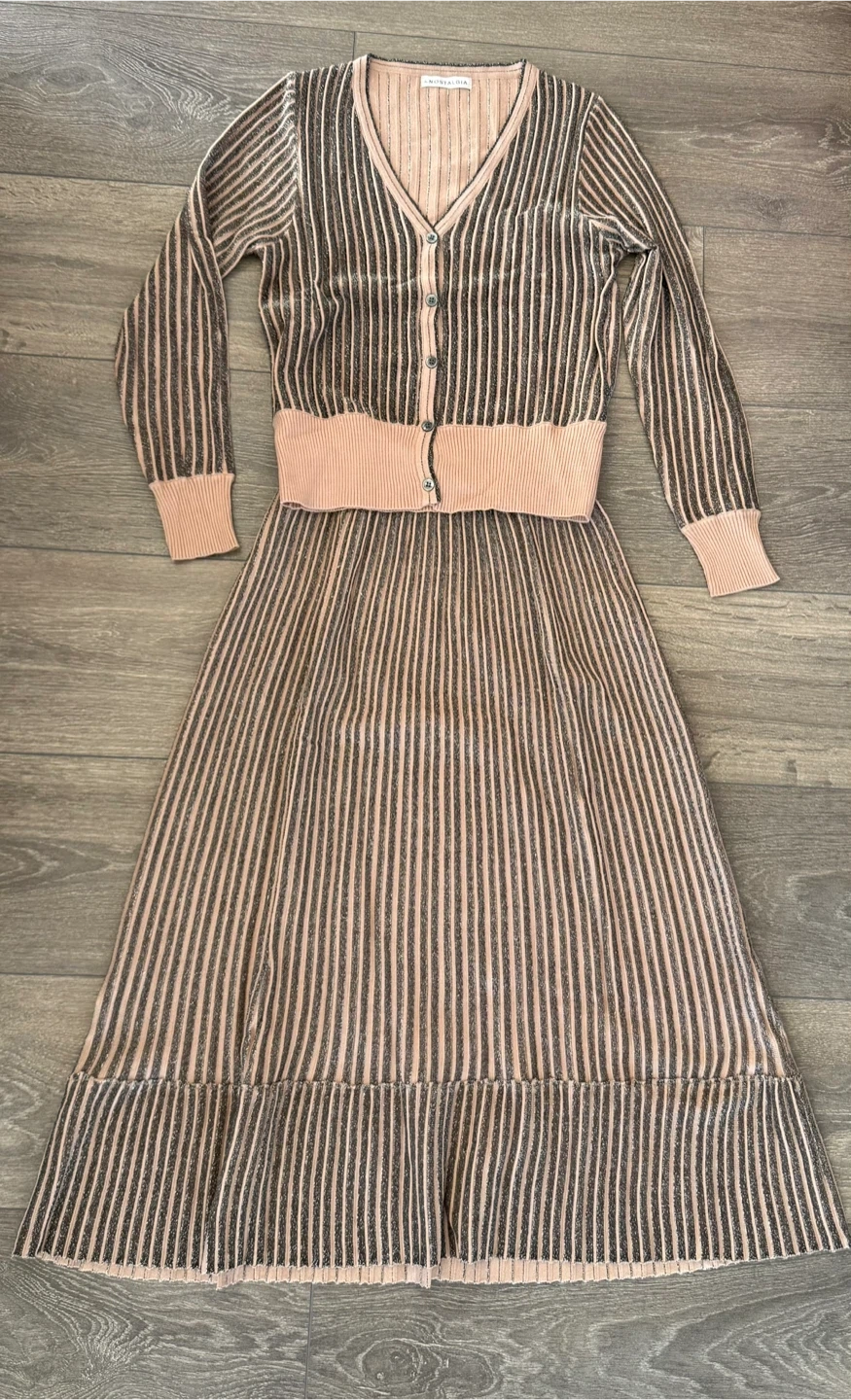 108Selling a cute striped knit cardigan and skirt set. The set features a vertical stripe pattern in shades of brown and beige. The cardigan has button closures, and the skirt has an elastic waistband. Perfect for a stylish and comfortable outfit!