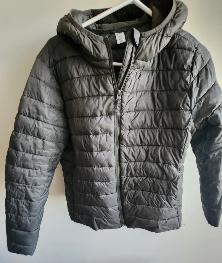 Selling a puffer jacket with hood in grey, size medium. It's in great condition and ready for the cooler weather!