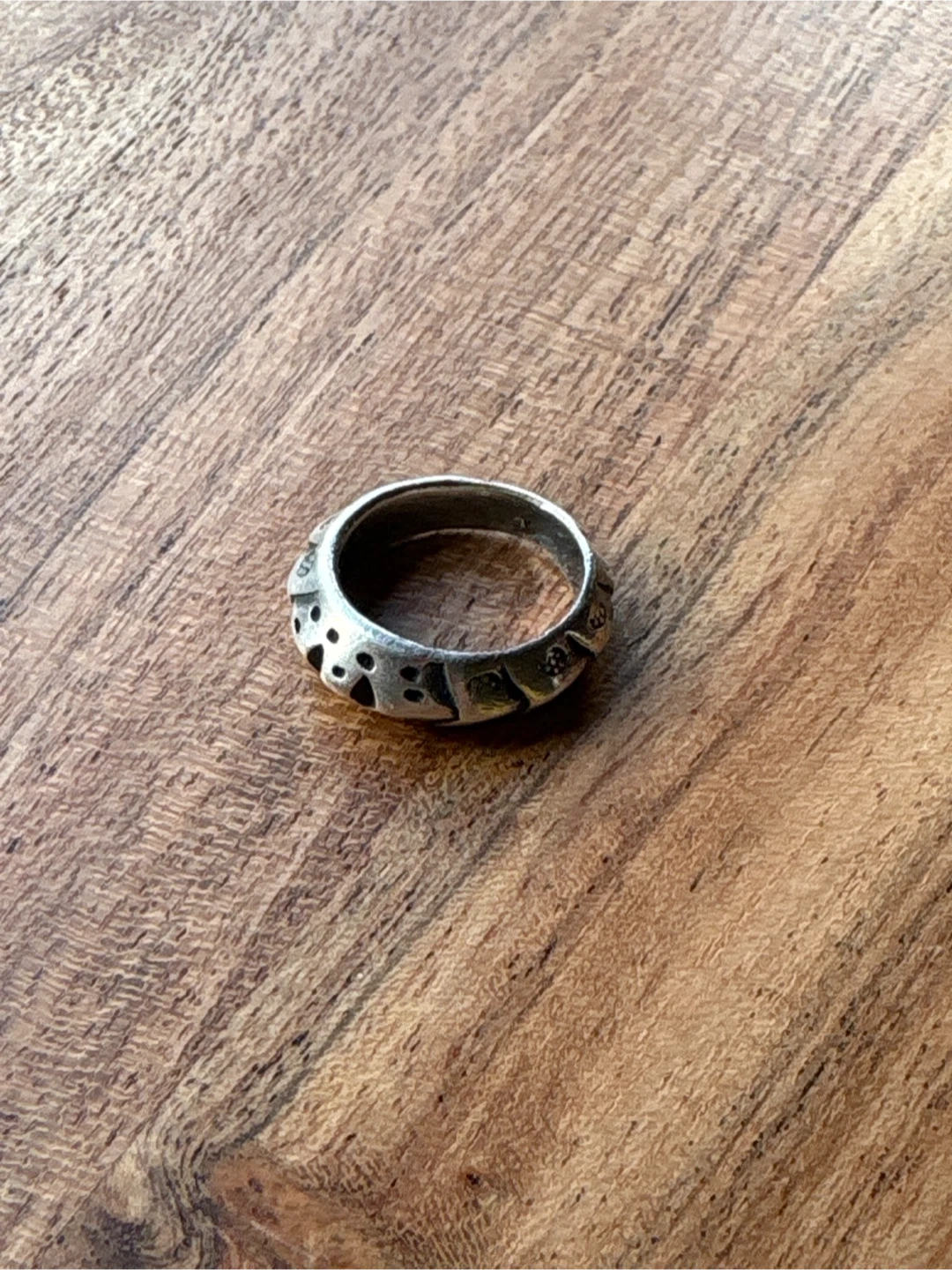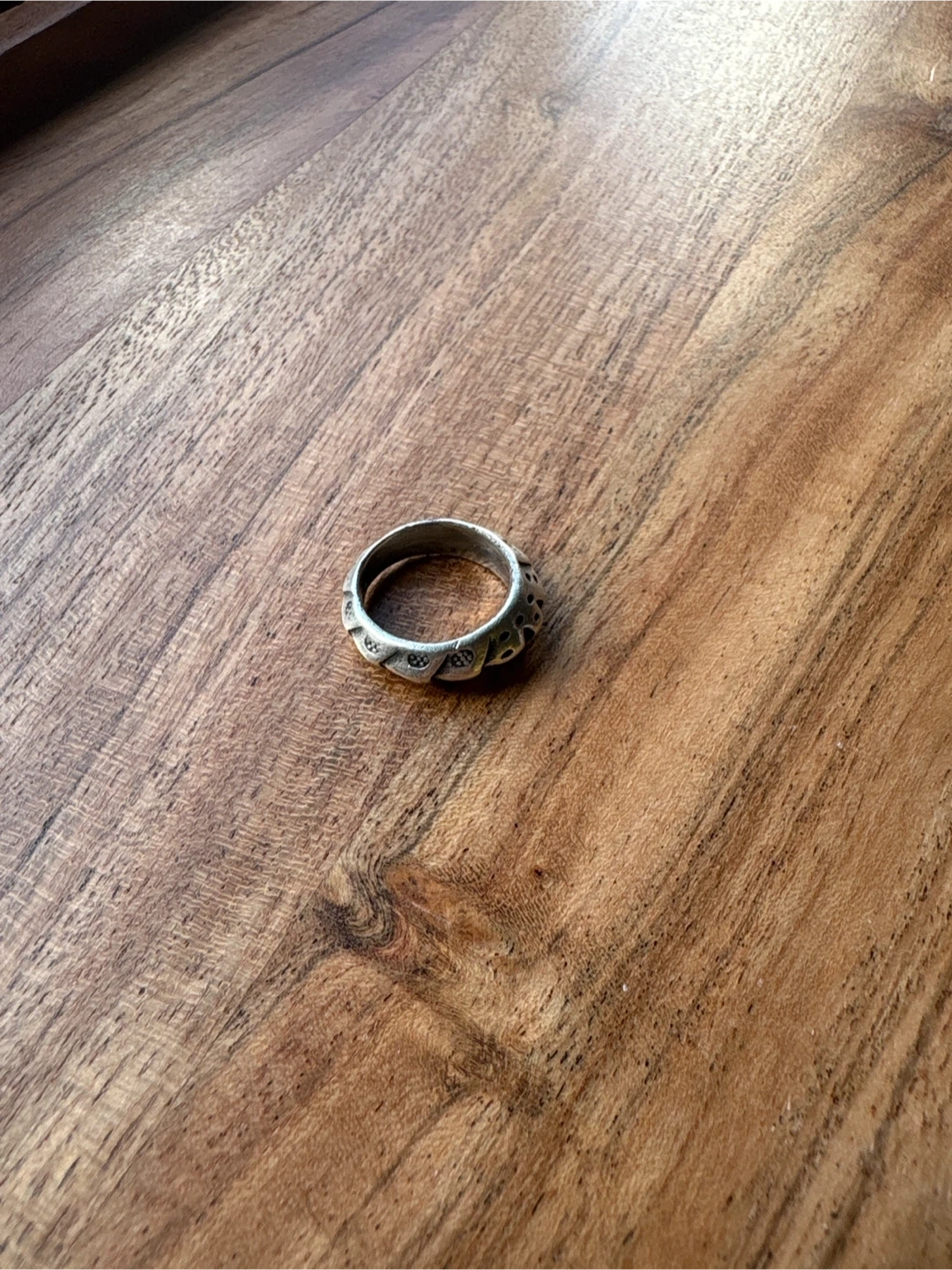 Selling a silver ring and a unique patterned design. It's in great condition and ready for a new home! It would make a great addition to your jewelry collection or a thoughtful gift for someone special