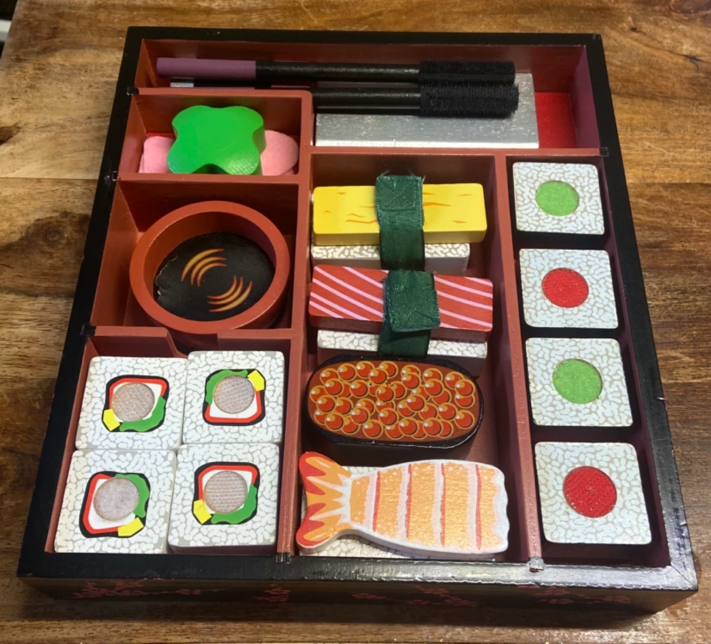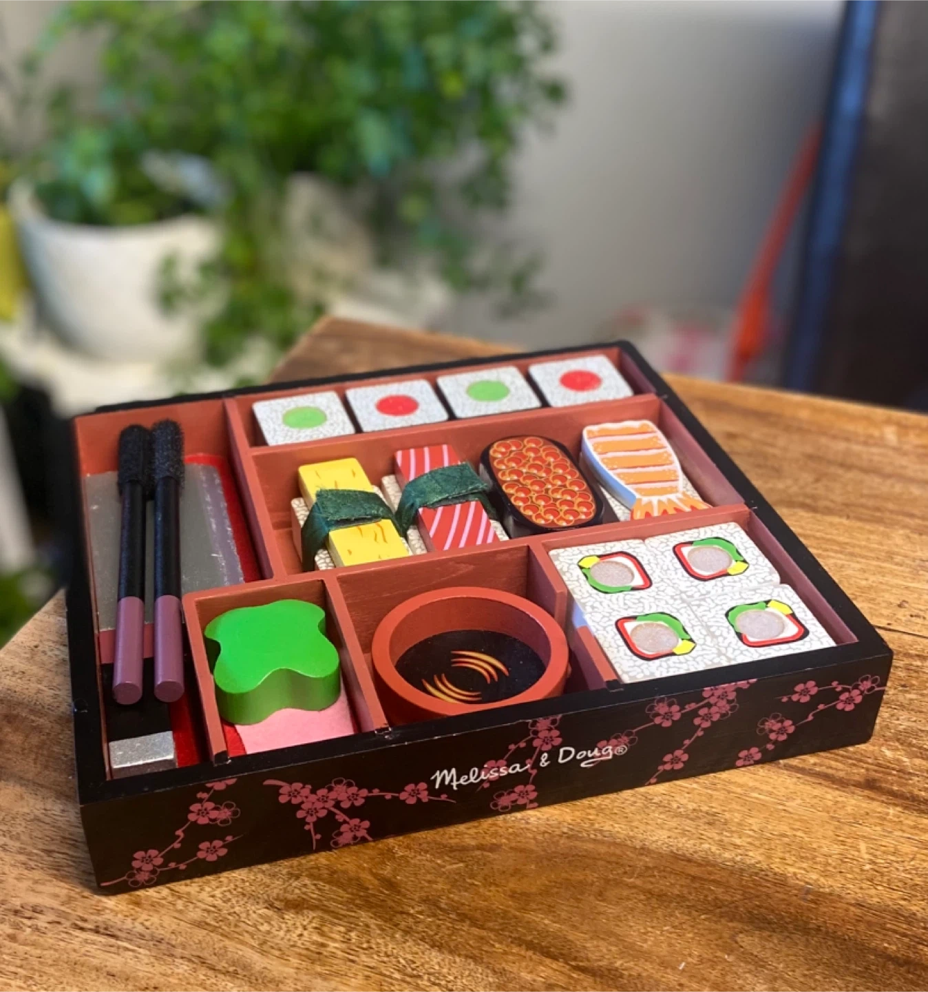This Melissa & Doug sushi set is perfect for pretend play! It comes with a variety of wooden sushi pieces, a serving tray, and chopsticks. It's a great way for kids to learn about different types of sushi and develop their fine motor skills. Complete set, like new, and smk-free