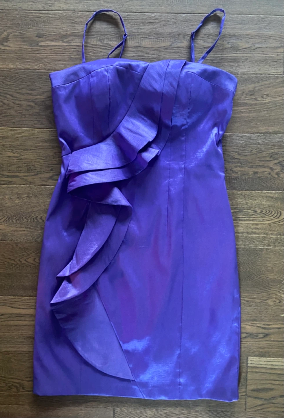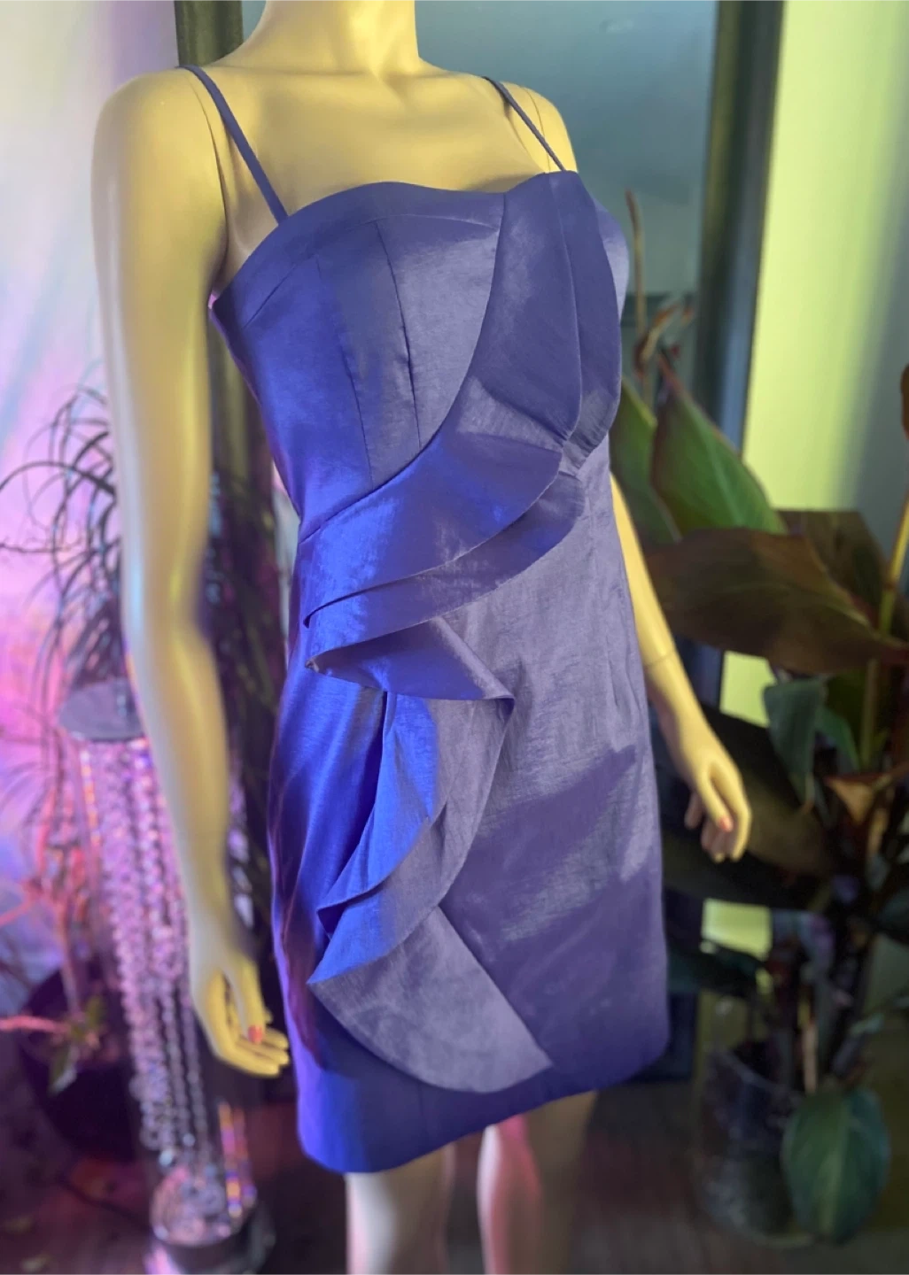 A stylish purple cocktail dress perfect for a night out or special occasion. It features a unique draped design on the front. This dress is sure to turn heads! Size 12. New with tags and smk-free