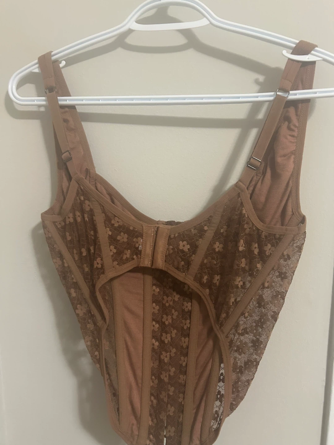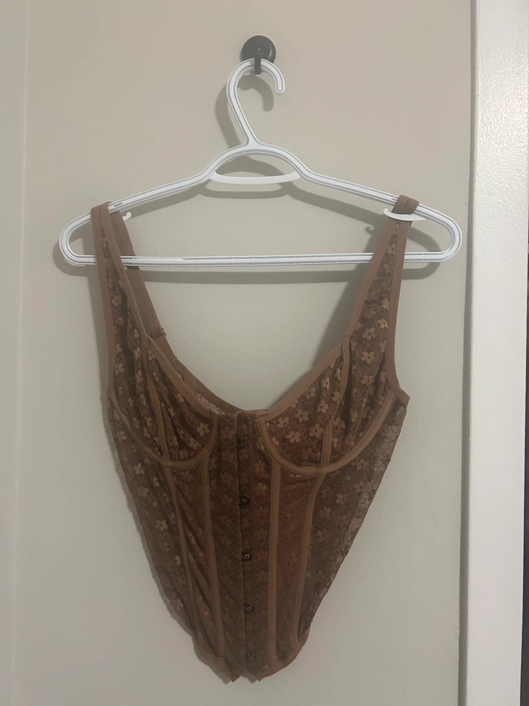 Selling a cute brown corset top with a floral pattern! It's in great condition (only worn once) and ready for a new home. Perfect for layering or wearing on its own. Says large but fits a medium