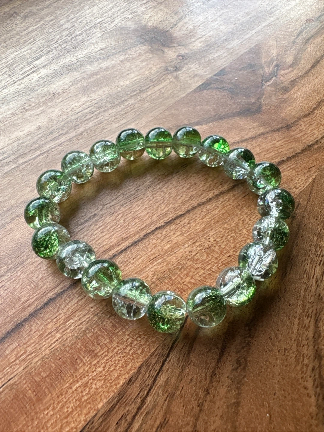 65This is a pretty green crystal beaded bracelet. The beads are a mix of clear and green, giving it a unique look. It would be a nice addition to any jewelry collection