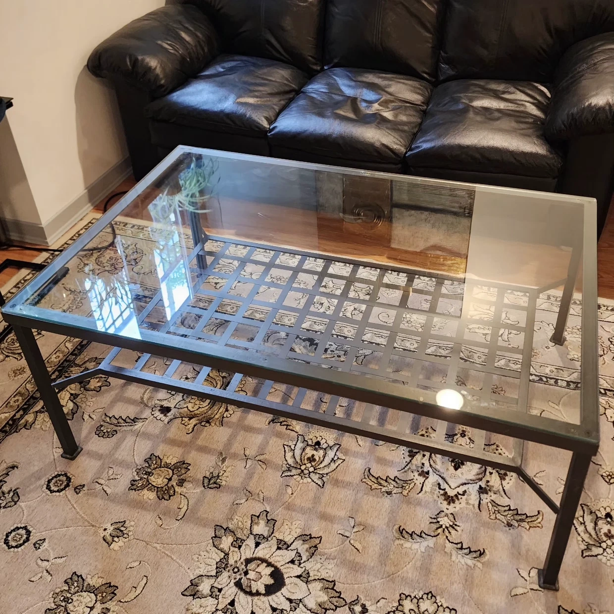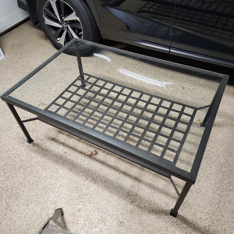 Selling a coffee table with a glass top and a metal frame. It's in great shape and would look lovely in any living room! The metal frame has a unique grid design on the bottom shelf, adding a touch of style. It's sturdy and ready for a new home